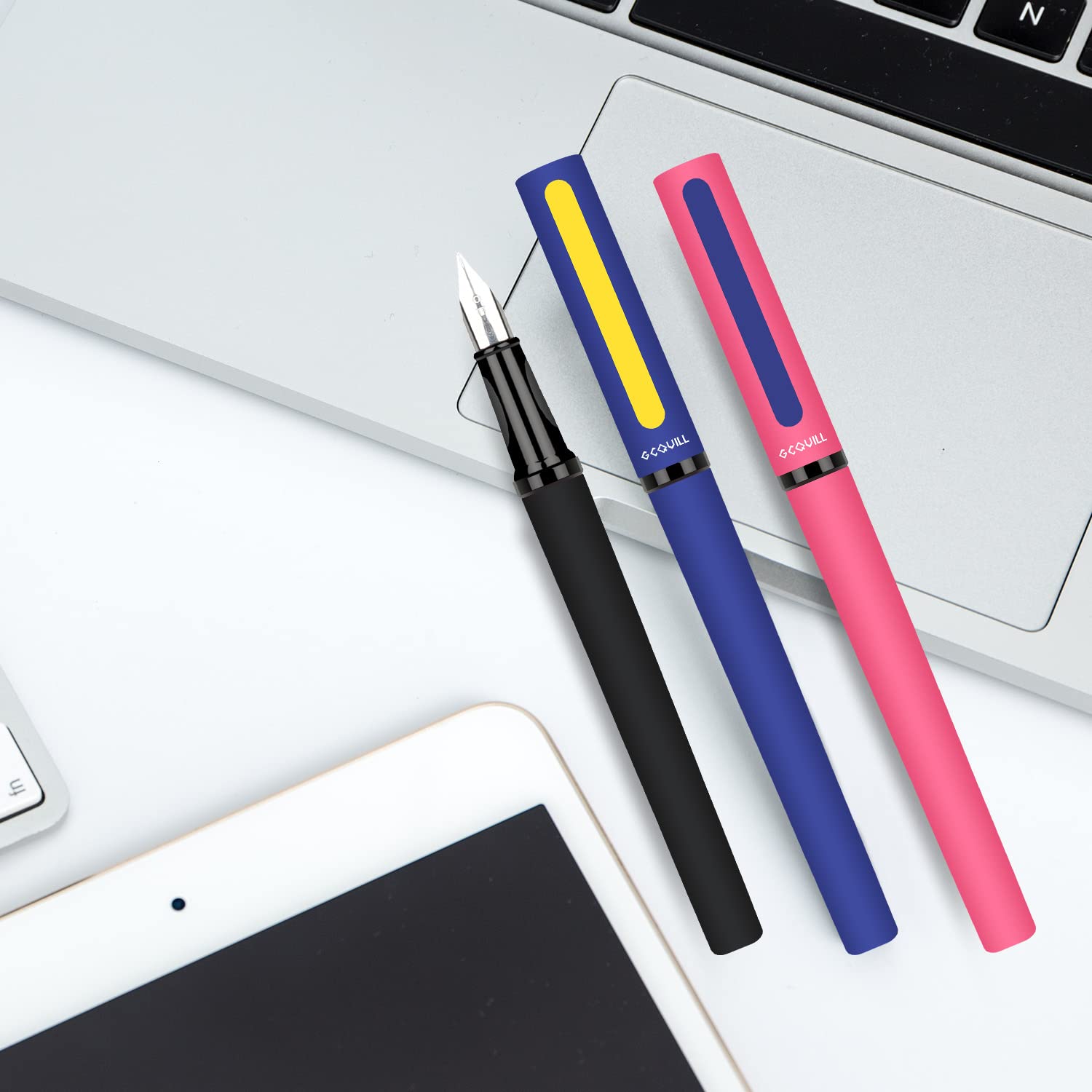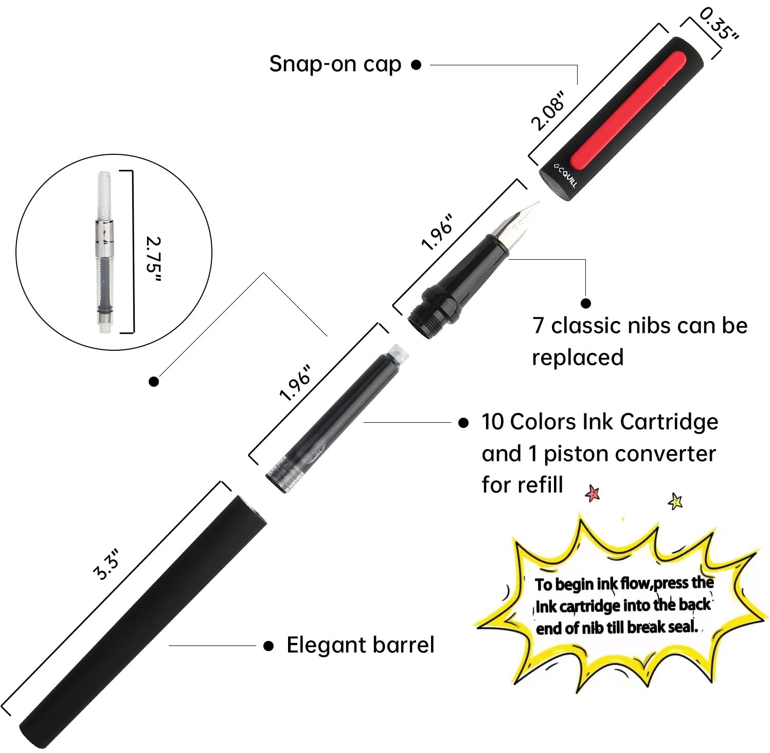 • 【3 Colorful Fountain Pens】 The 3 fountain pens were includes the piston converters. You can extract your preferred ink with the piston converters. The black, navy and pink fountain pens are created for varied occasions and moods. The classic black fountain pen with a red clip can be used in formal office workings. The causal navy fountain pen with yellow clip can be used in daily personal use or calligraphy practice. The playful pink pen with navy clip offers enjoyable coloring and fun artistic creation. Differed colors for your varied mood.