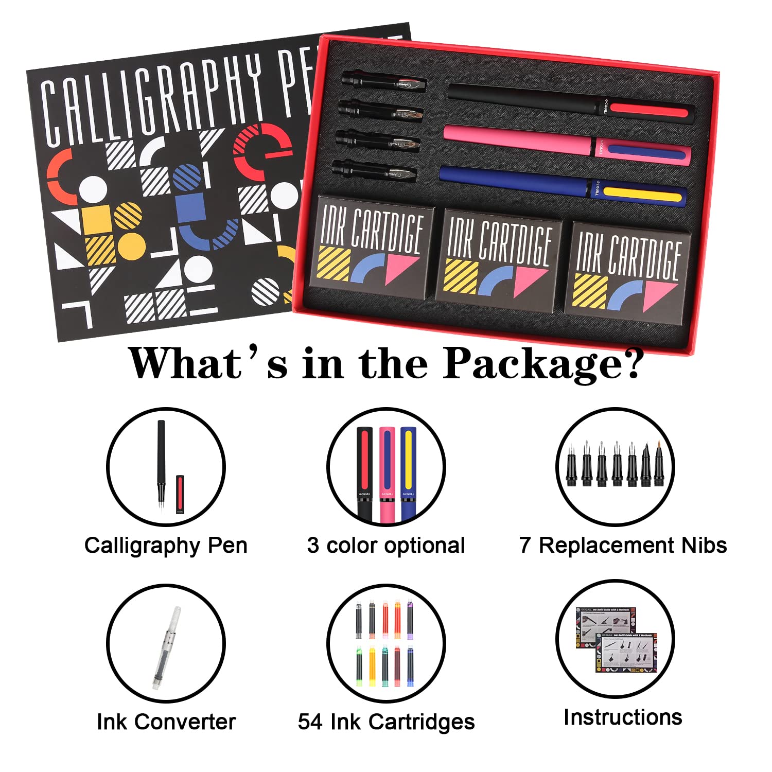 GC QUILL Calligraphy Pens Set 64pcs - Calligraphy Fountain Pen Set with 3 Fountain Pens, 7 Varied Nibs, 54 Ink Cartridges(10 Colors) - Writing, Drawing and Calligraphy Practice for beginner GC-F354