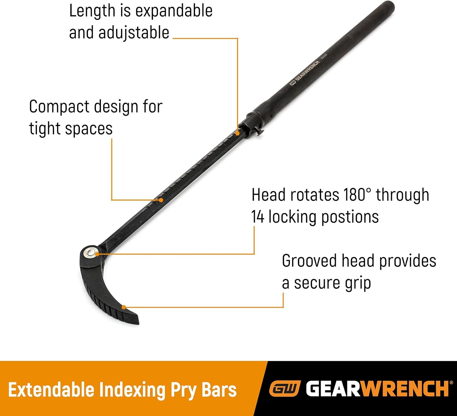 Details: For fast-moving jobsites or heavy-duty work, only an adjustable pry bar can handle the broad range of challenges professionals face. The GEARWRENCH Expandable Indexing Pry Bars have a rotating head with built-in grooves to grip in any environment and can extend to reach areas inaccessible to shorter tools.