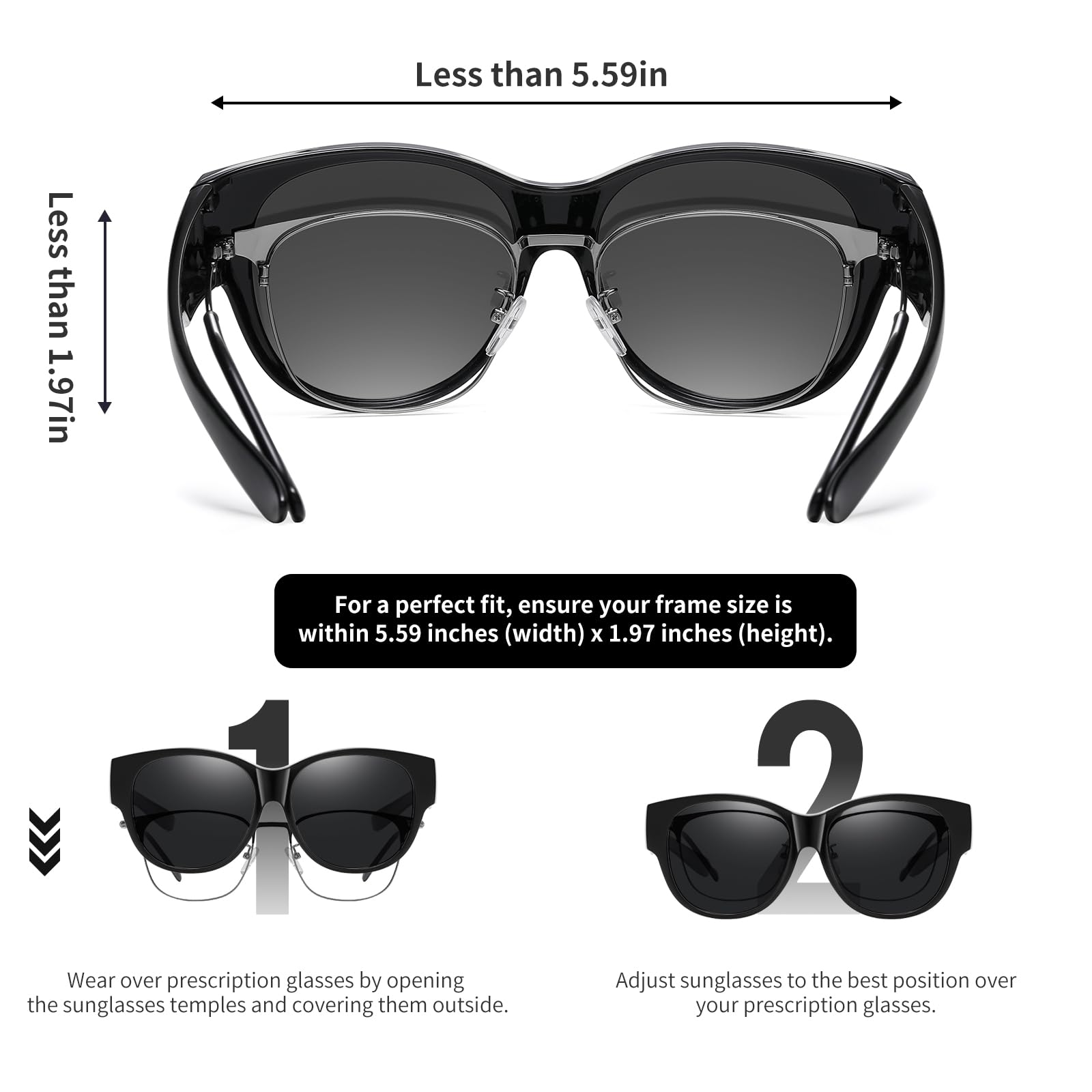 • SUNGLASSES FIT OVER GLASSES: These sunglasses are specially designed for those who wear prescription glasses, easily wear over regular glasses. (frame length within 5.67 inches & frame height within 1.81 inches)