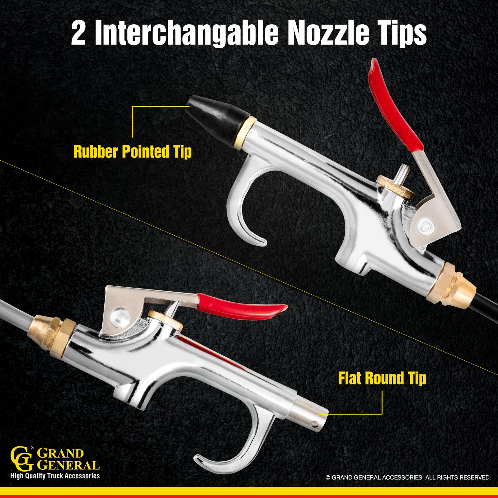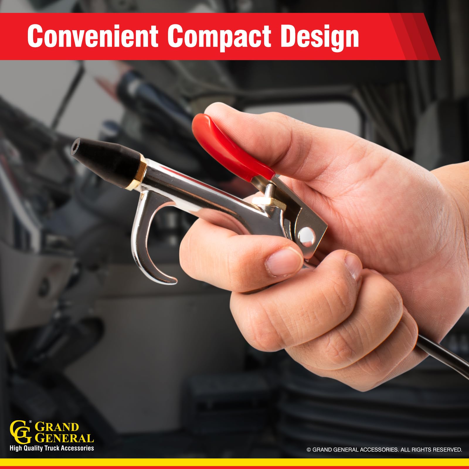 Details: Customize your vehicle with Grand General heavy-duty truck air seat blow Gun kit. Grand General is a leading manufacturer and distributor of high quality accessories featuring an extensive selection of chrome and stainless steel products. The air seat blow Gun kit is designed for trucks with an air ride seat system. The nylon hose extends up to 8 feet long to give it that special clean from the cab to the sleeper. The blow Gun kit include two interchangeable nozzle tips. This air seat blow Gun kit is commonly used on trucks, buses and utility vehicles. Grand General air seat blow Gun kit is a premium quality choice.