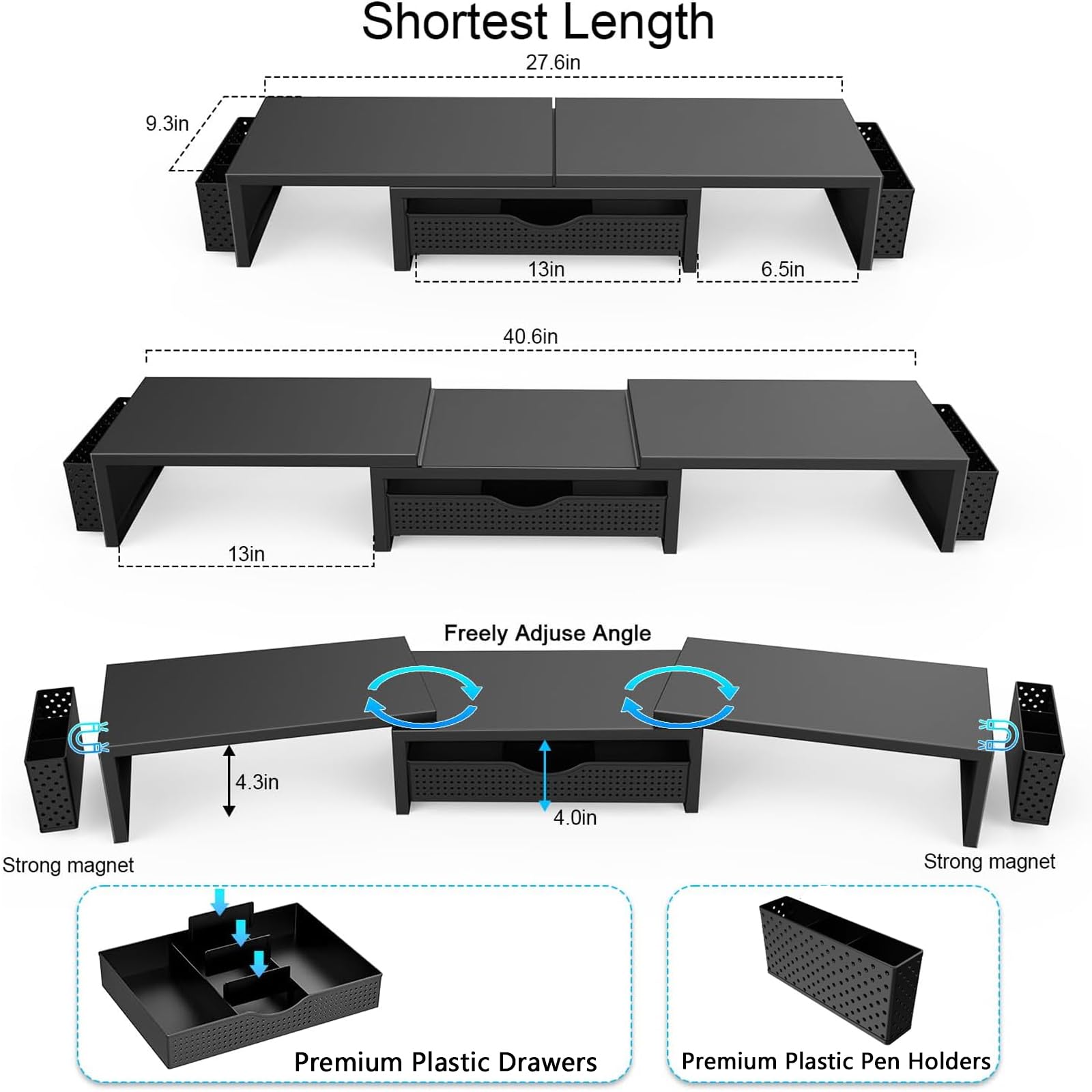 • 【Ample Storage Space】The dual monitor stand features two magnetic pen holders and a drawer, allowing you to easily organize your desk accessories and office supplies, keeping your workspace clear and tidy for easier access.