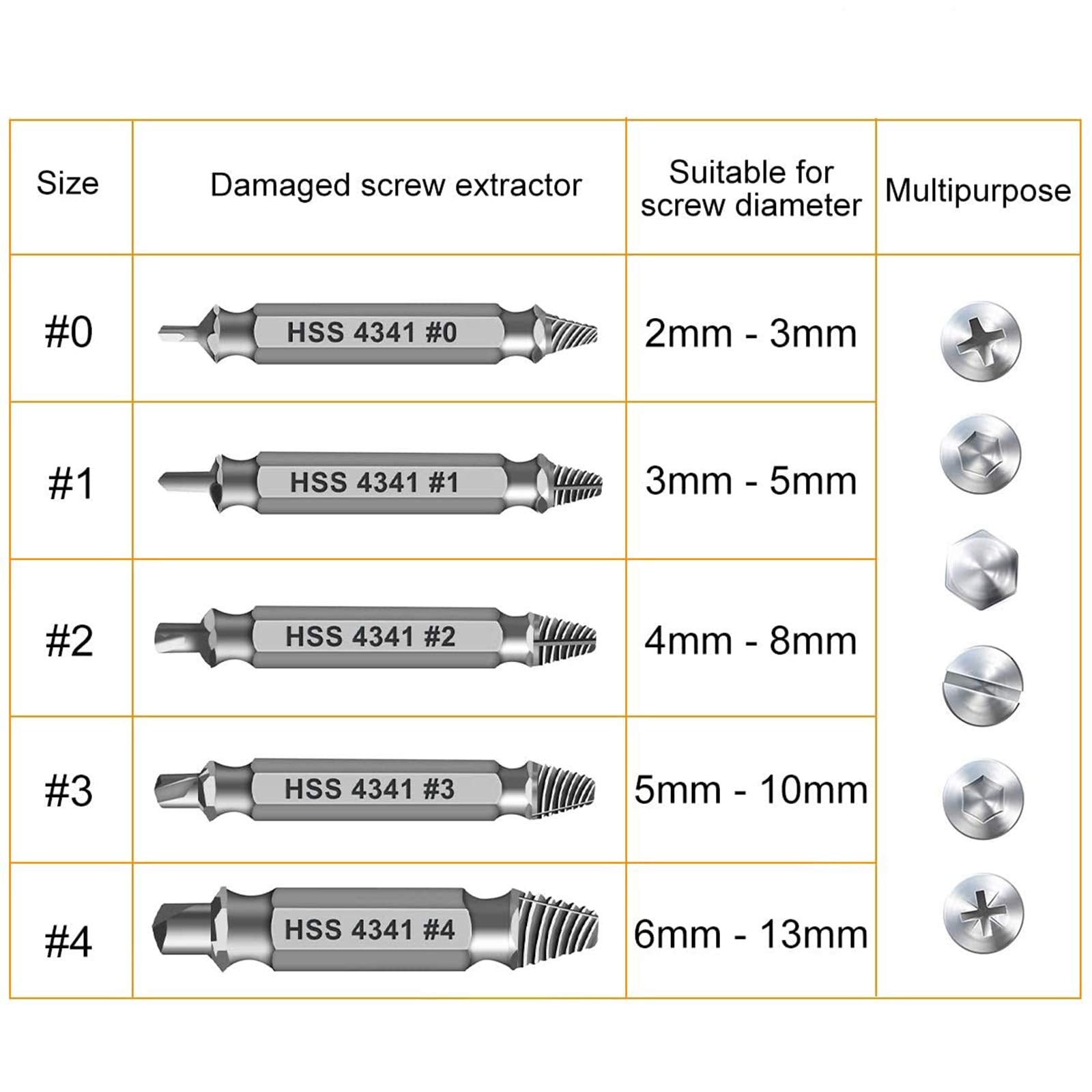 • HIGH QUALITY - This damaged screw remover tool kit is made from High-Speed Steel H.S.S 4341# , which have high hardness of 63hrc, it's durable and easily to remove any damaged screws.