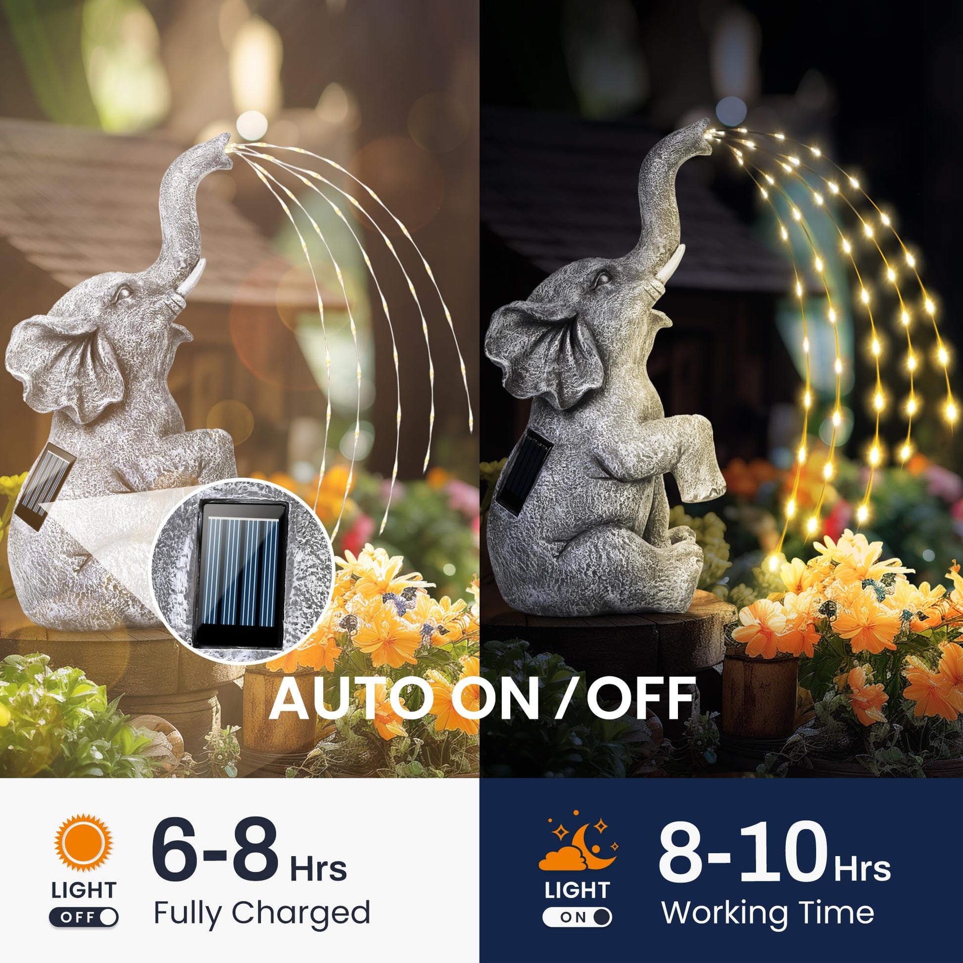 • Garden Decor: This elephant figurine is made of high-quality resin with solar-powered LED strings. At night, when the solar string lights up and looks like water flows, adds a warm and lively atmosphere to the garden, yard, or patio