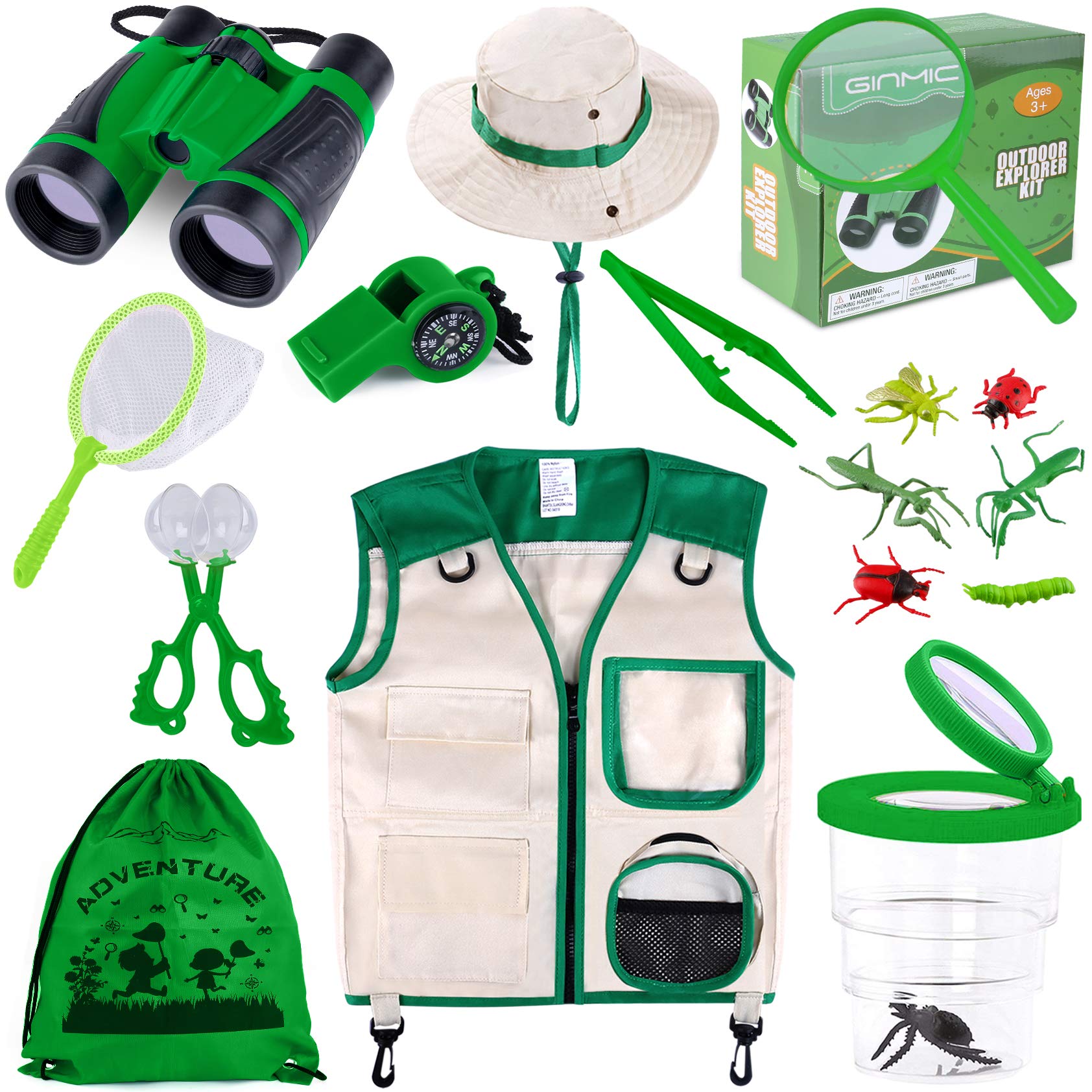• 【Great Kids Camping Set】- GINMIC Kids Explorer & Bug Catching Kit Includes Binoculars, Costume Vest, Hat with Quick Release Neck String, 6 Realistic Insects, Magnifying Glass, 2-in-1 Whistle and Compass, Butterfly Net, Bug Catcher, Insect Tweezers, Bug Container & Viewer, Drawstring Bag for 3-12 years old boys & girls. Meets everything you need at a outdoor adventure!!