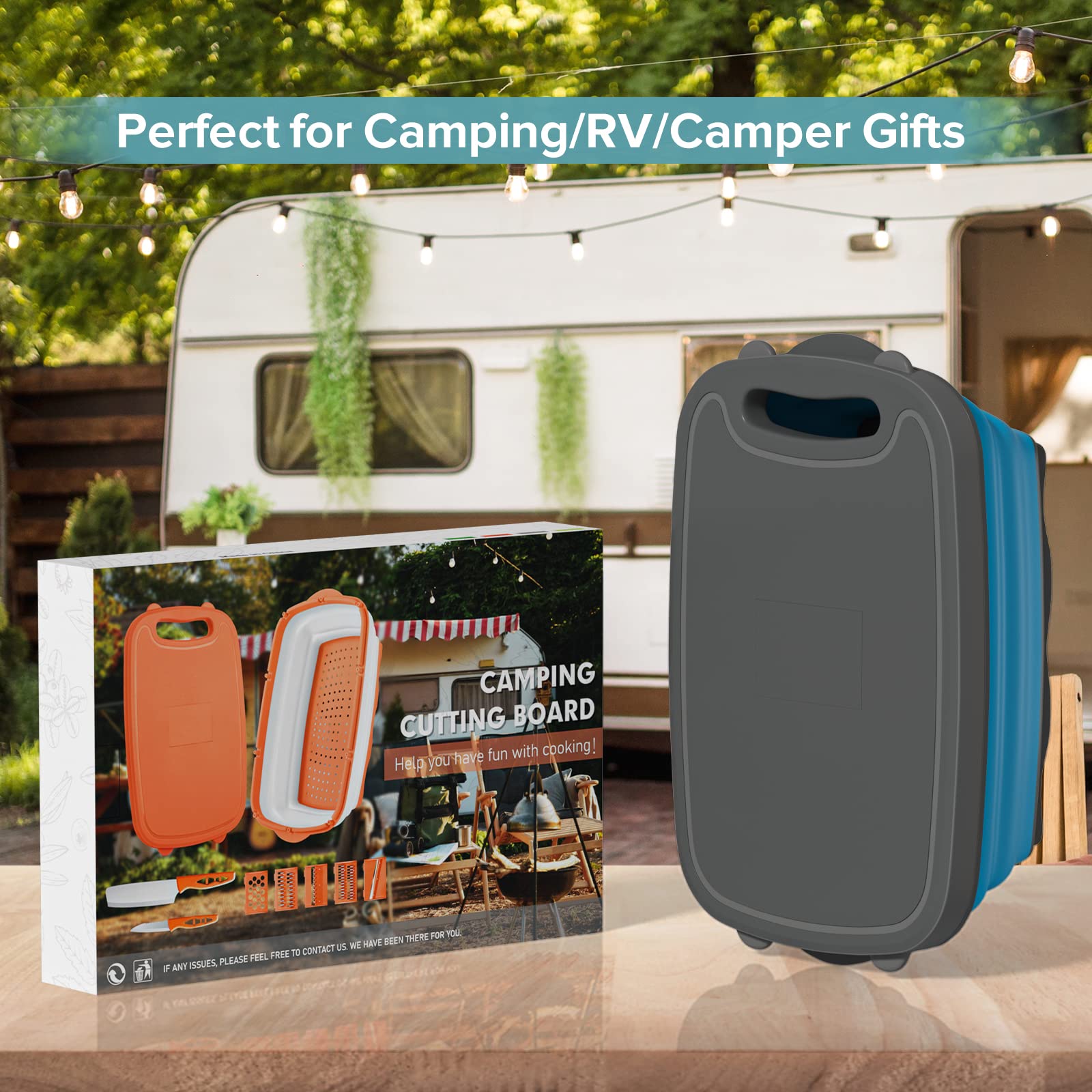 Gintan Camping Cutting Board, 9-in-1 Collapsible Chopping Board with Colander, Kitchen Vegetable Washing Basket for Camping, Camping Gifts Camping Accessories for RV Campers (Blue+Grey)