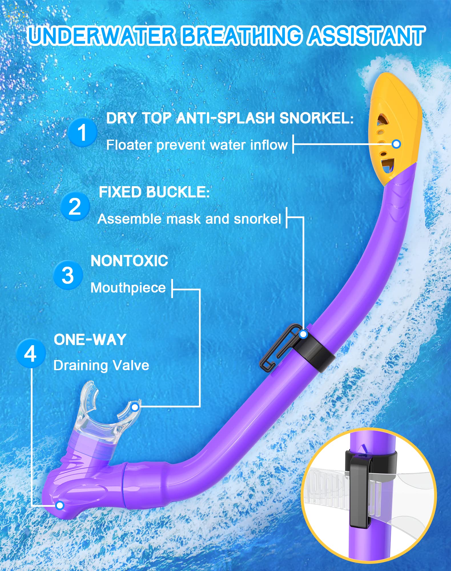 • 🐬【Dry Top Anti-Splash Design Secures Kid's Safety】Snorkeling Set installs an one-way inhalation valve and has a buoyancy ball on the top of it. Once the tube is underwater, the tube entrance will be closed by the buoyancy ball. NOTE: Please clean sands in the tube carefully before next time use.