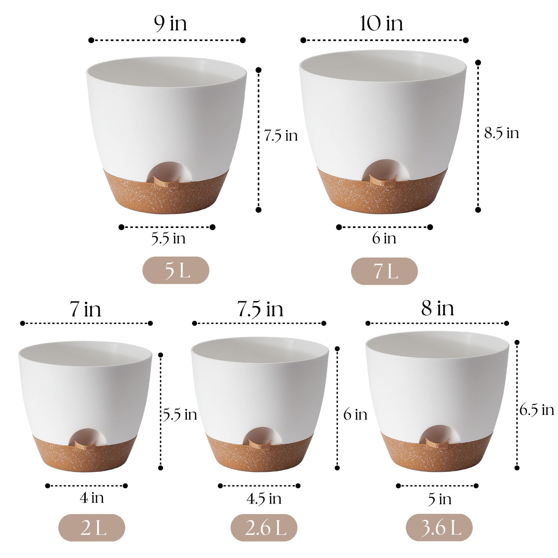 Giraffe Creation Plant Pots Set of 5 (10/9/8/7.5/7 inch), Self-Watering Indoor & Outdoor Flower Planters with Drainage Hole and Reservoir, White