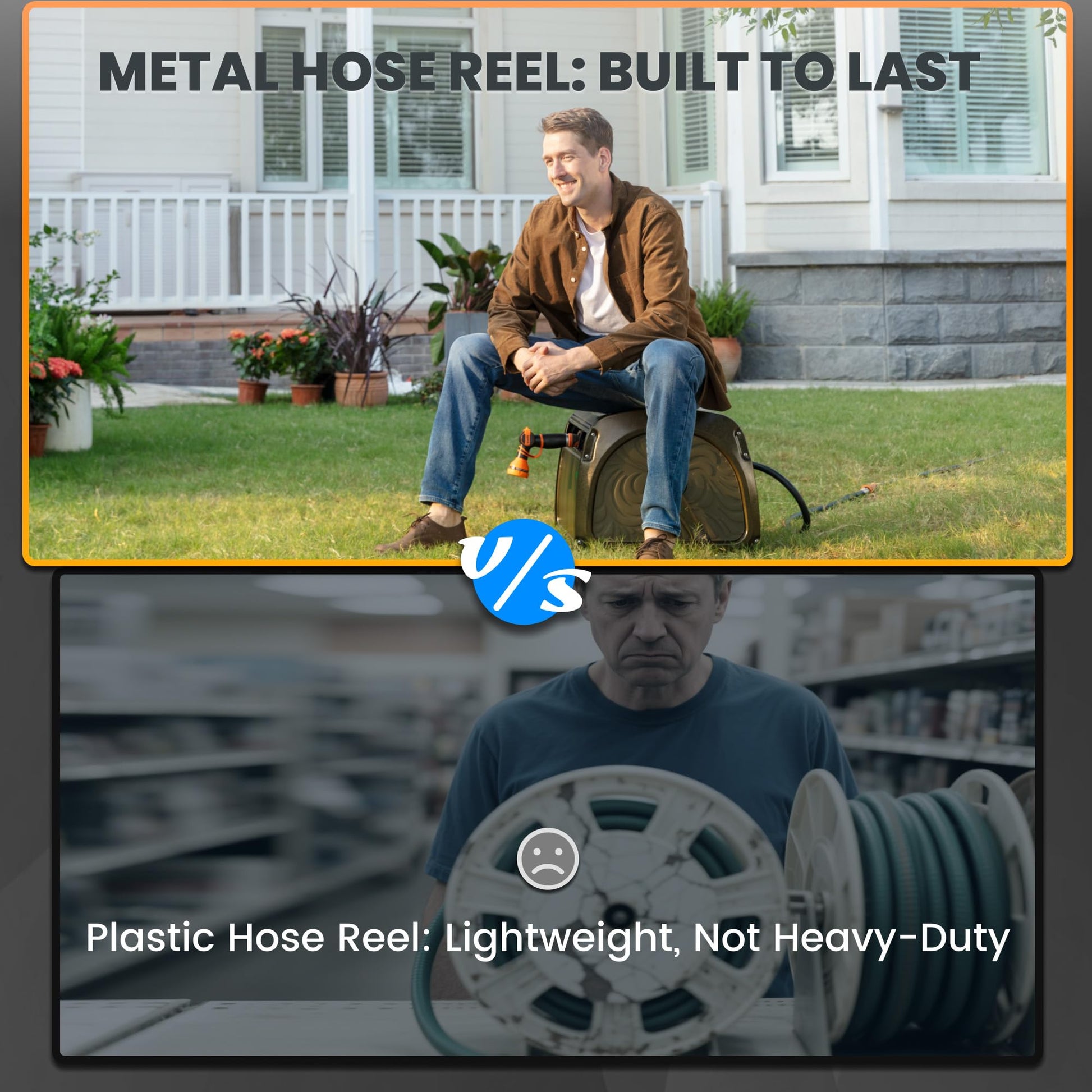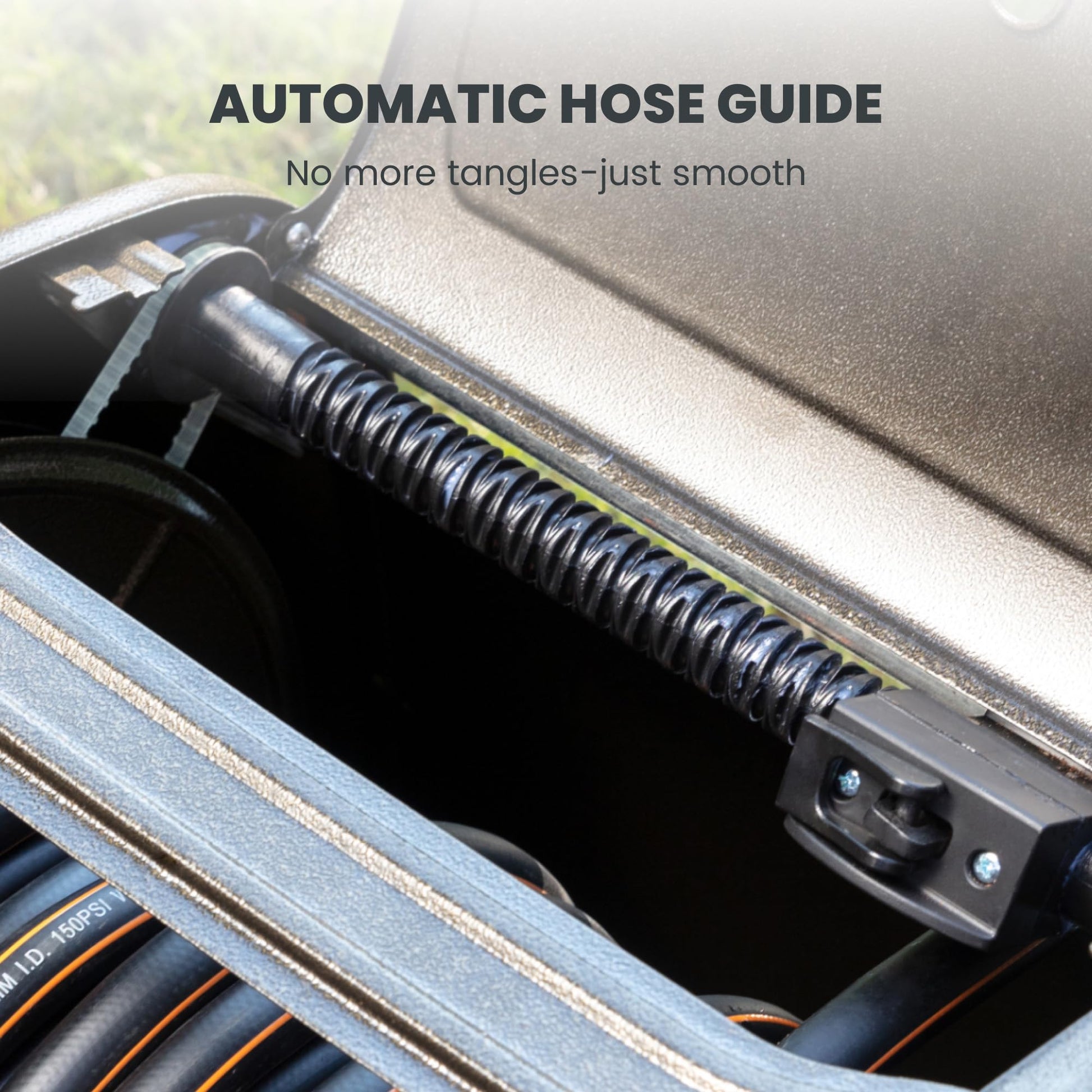 • EASY WINDING - Make garden hose storage simple and clean! The easily assembled crank handle and the hose guide helps you manually wind the hose evenly around the reel with less mess.
