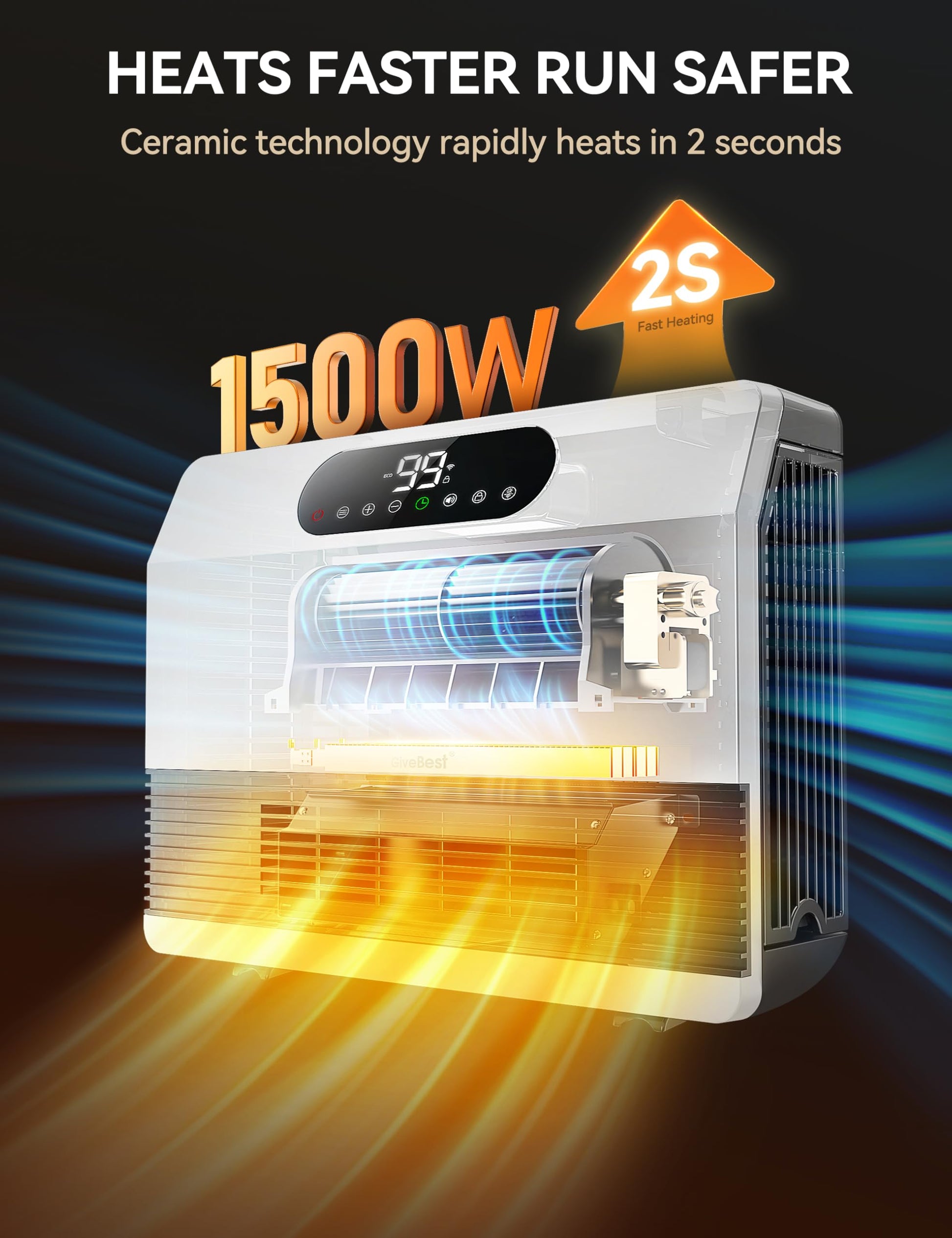 • 2S Fast Heating & Multiple Modes: The GiveBest wall space heater heats up more efficiently with up to 1500W working power, reaching your desired temperature immediately, letting you feel fast, balmy heat straight away. Choose from 5 heating modes ECO, P3(1500W)/P2(1200W)/P1(900W), FAN Only according to your needs