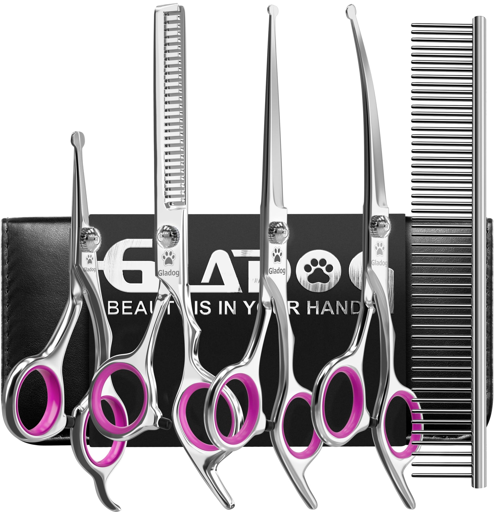 GLADOG Dog Grooming Scissors Kit with Safety Round Tips, Professional 6 in 1 Grooming Scissors for Dogs, Sharp and Heavy-duty Dog Grooming Shears for Dogs Cats Pets (Pink)