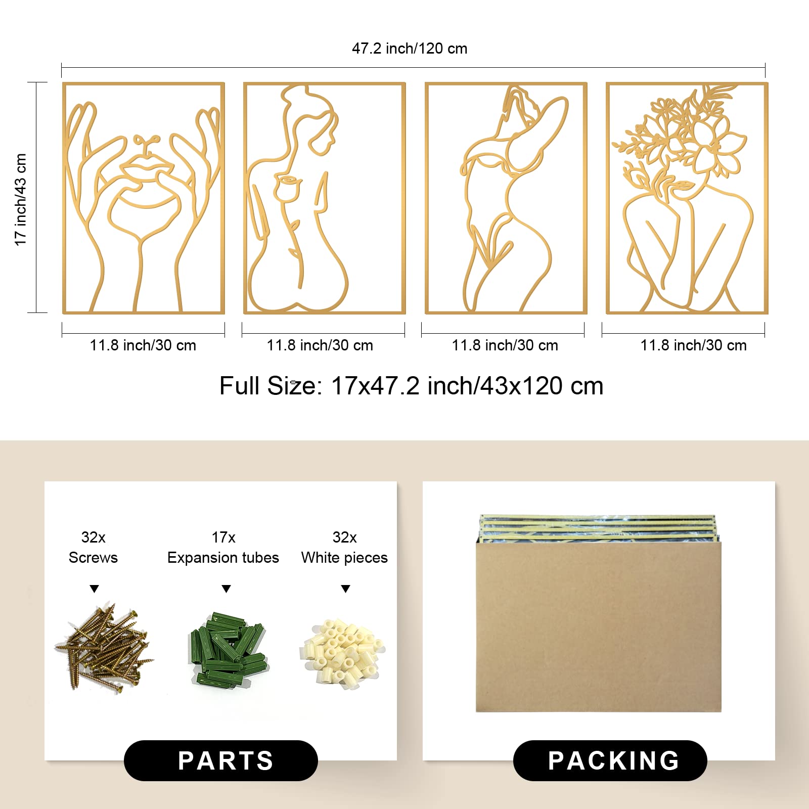 Glamativity 4 Pack Gold Wall Art Décor, Minimalist Single Line Real Metal Wall Art, Woman's Body Shape Abstract Wall Art (Gold Classic Style, 17 x 11.8'')