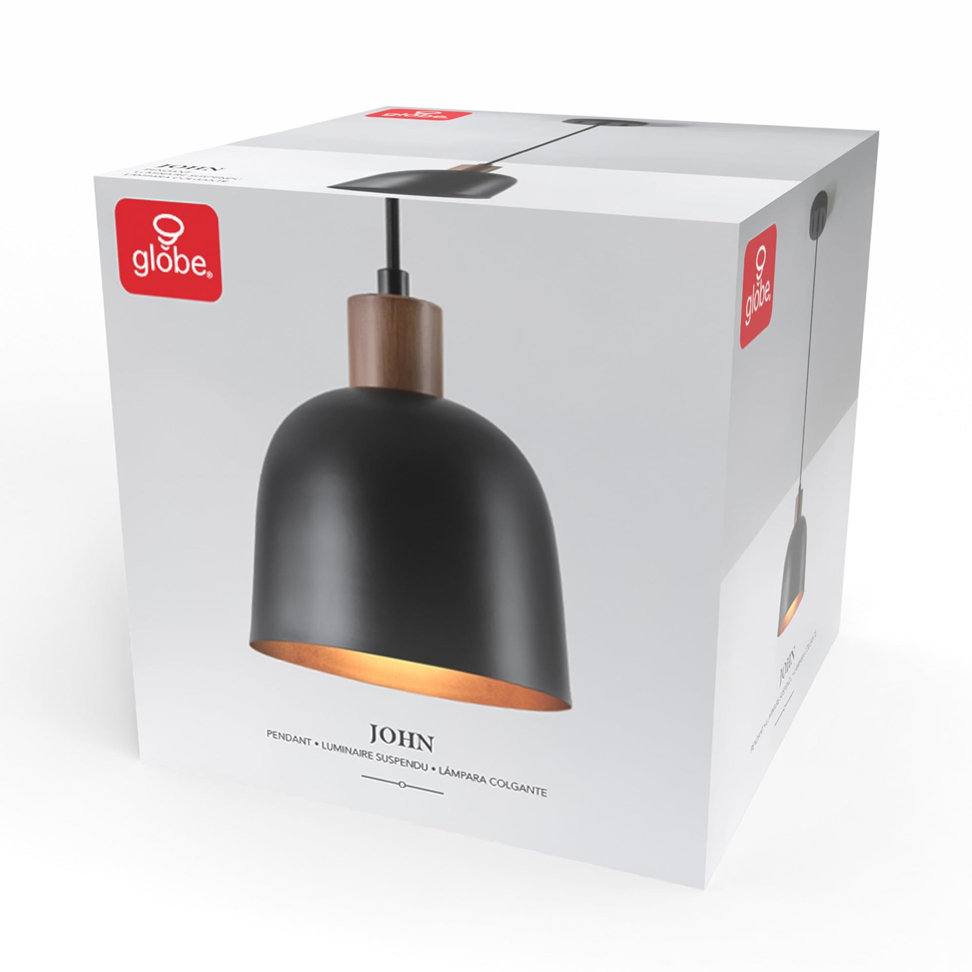 Details: Illuminate your space with the 1-Light Matte Black Pendant Light by Globe Electric, featuring a modern design that complements any décor. The classic black finish paired with a wood-toned accent adds a touch of warmth, making this pendant a truly timeless piece. This ceiling light fixture requires a 60W E26/Medium Base bulb (sold separately), compatible with both LED and incandescent bulbs, offering versatile lighting options. Installation is a breeze with all mounting hardware included, allowing for a maximum hanging height of 69.66" and a minimum of 10". Fully dimmable with a compatible dimmer switch (sold separately), you can easily create the perfect atmosphere for any occasion. The matte black finish and black hanging cord make this pendant a favorite neutral choice among designers. For added convenience, automate your lighting with a Globe Electric Smart bulb, giving you endless lighting solutions at your fingertips!