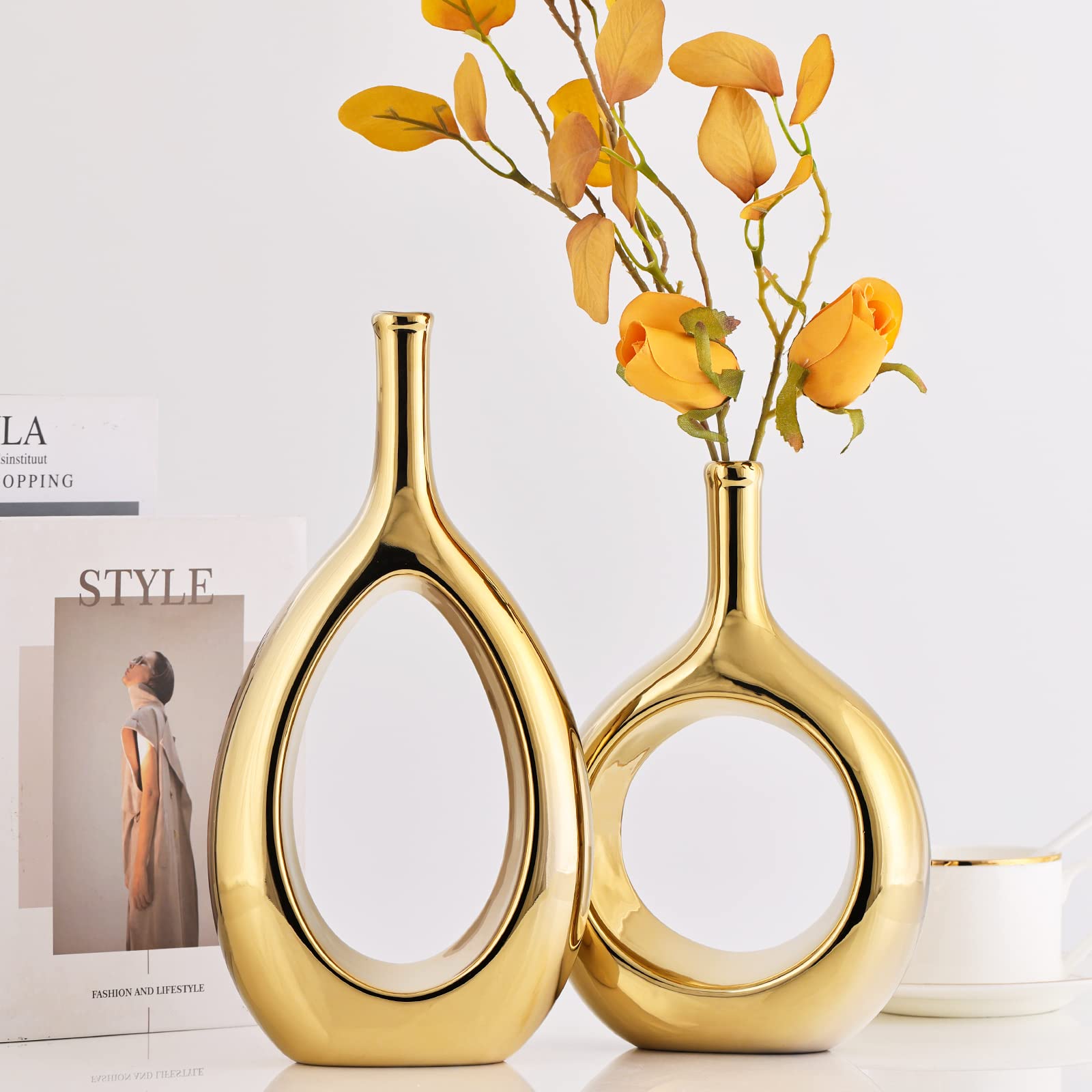 Glossy Gold Ceramic Vase Set 2,Modern Hollow Circle with Hole Flower Vase for Home Decor,for Table Centerpieces,Farmhouse,Fire Place,Living Room,Bedroom,Office,Bookshelf,Rustic Decor