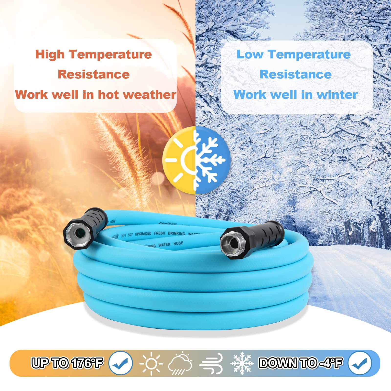 • Food Grade Fresh Water Hose: Gociean rv clean water hose is Certified of CA65 standard, lead free, BPA free and phthalate free. Healthier for your family during rv travel.