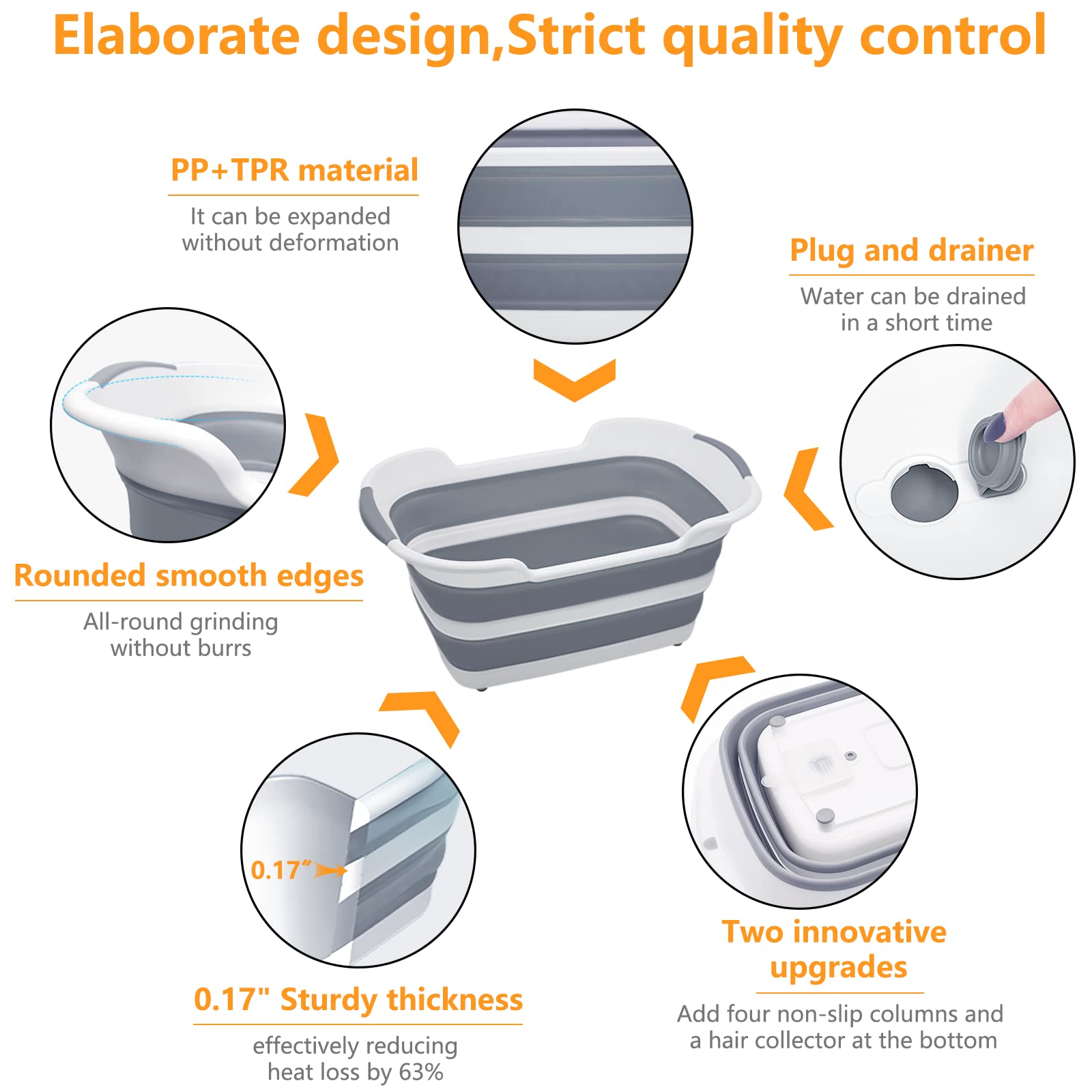 • 【Space-Saving and Foldable】The collapsible bathtub is made of flexible thermoplastic rubber (TPE) + premium PP material. Expanded size:23.8 x 15.6 x 11.6(h) inches.Collapsed:3.7 inches. The exterior bottom dimension is about 16 x 8.3 inches. Capacity: 27 L / 7.1 gallons