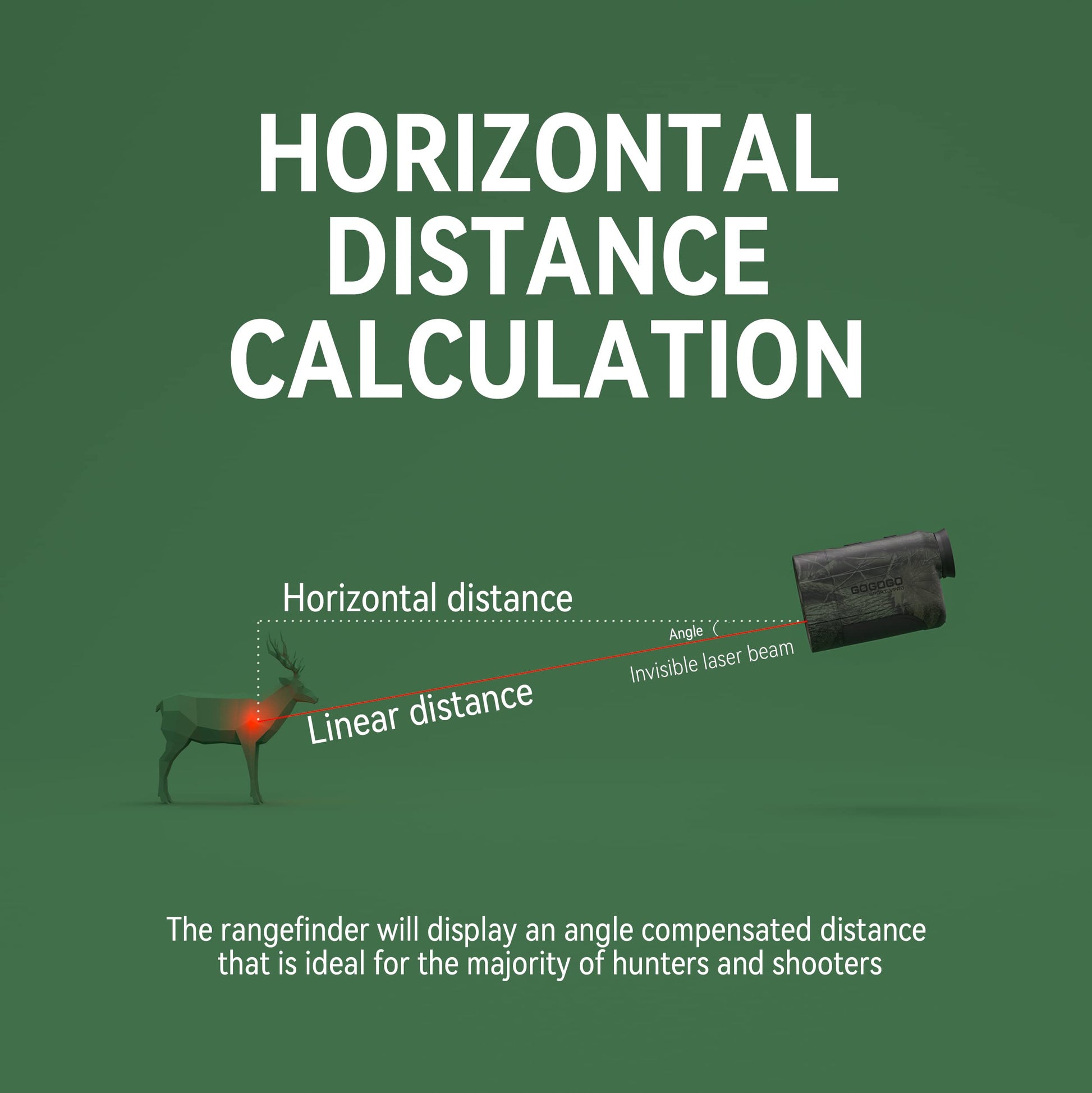 • Precise Targeting for Hunters: With Mode 1 (Horizontal Distance) providing the true ground distance and Mode 2 (Slope Compensation) adjusting for terrain incline or decline, this rangefinder ensures hunters can accurately calculate the distance to their target, whether on flat ground or uphill/downhill slopes, enabling more precise and reliable shots.