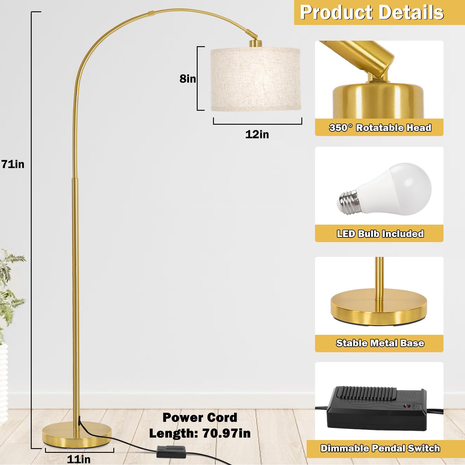 Gold Arc Floor Lamp, Dimmable Floor Lamp for Living Room, Mordern Standing Light with Adjustable Lamp Head, Tall Pole Lamp Over Couch Arched Light for Reading, Bedroom, Office, 9W LED Bulb Included