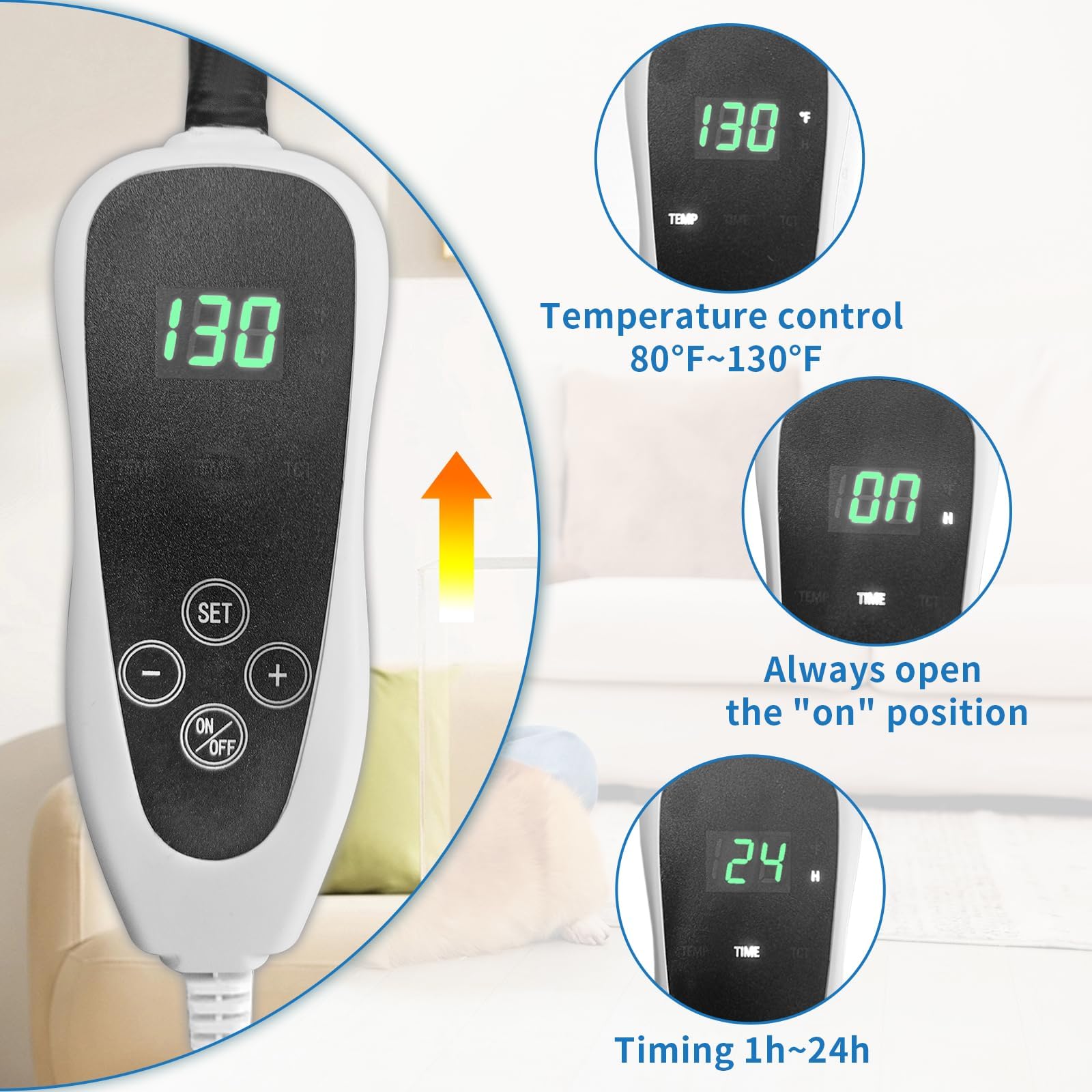 • Intelligent Thermostat: Adjustable temperature 80°F~130°F, the opening time between 1 hour~24 hours is freely adjustable, new normally open function "on" gear. Please note that turn off the pet heating pad promptly after use