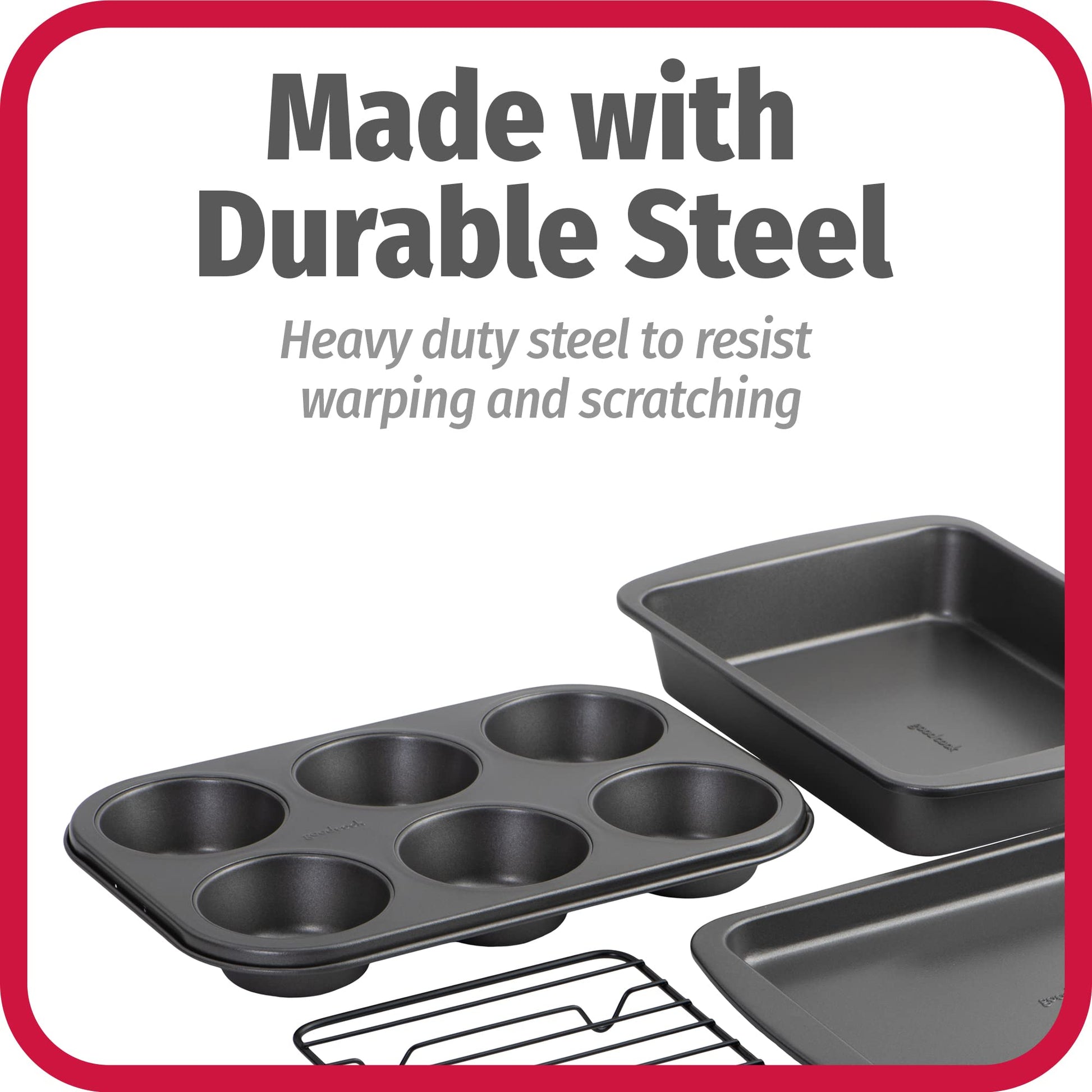 GoodCook 4-Piece Nonstick Steel Toaster Oven Set with Sheet Pan, Rack, Cake Pan, and Muffin Pan, Gray, 4-Piece Set Distributes Heat Evenly, Nonstick Coating, Dishwasher-Safe