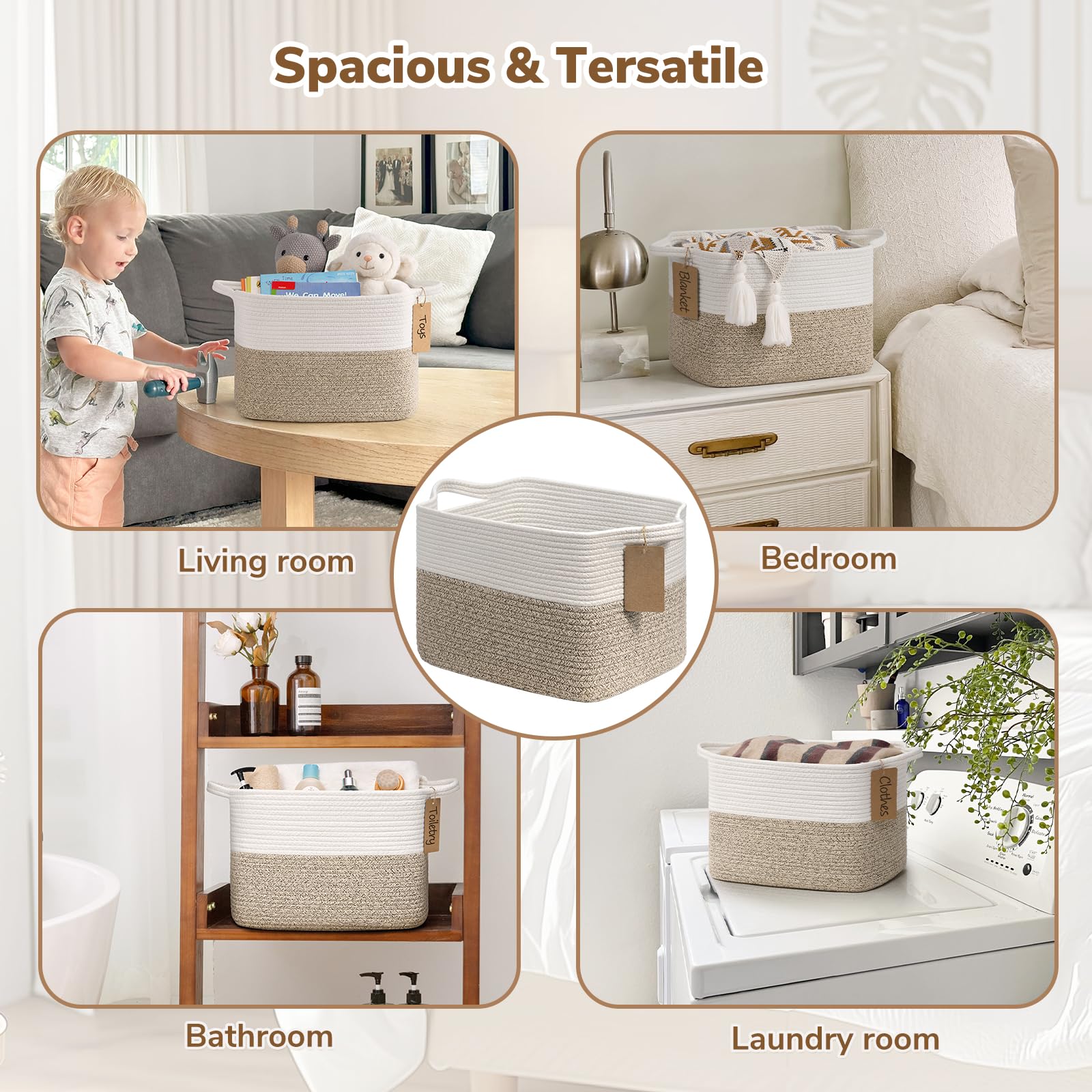 • Soft Material. The decorative basket is made of cotton rope with a soft touch, which is perfect for home use, especially for toddlers, babies, children, and pets. It's a smart choice for organizing clothes, toys, stuffed animals, blankets, and even throwing pillows​
