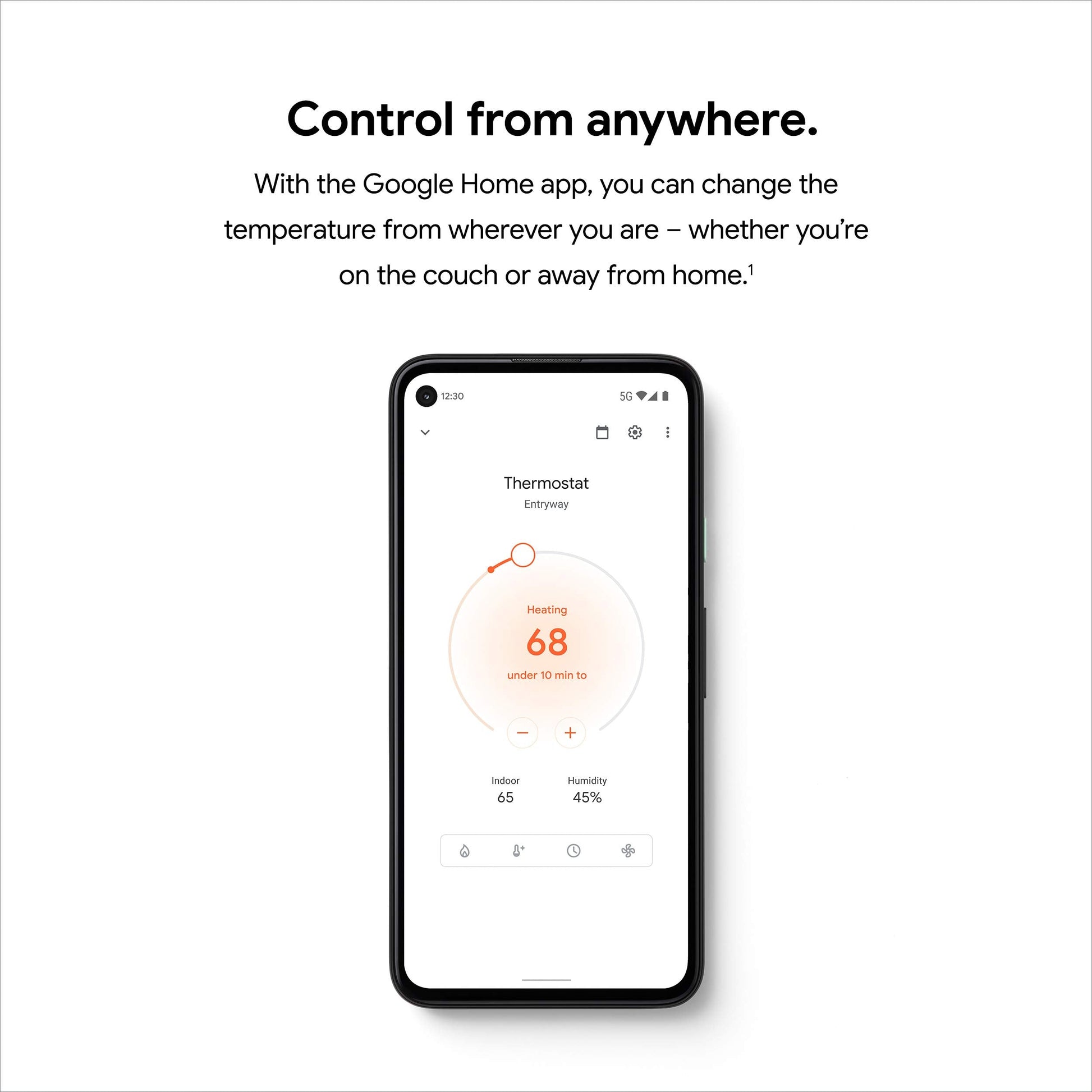 Details: Meet the Google Nest Thermostat, the smart thermostat at a cozy price. It can turn itself down, so you can save when you’re away, and it’s comfortable when you come back home.[1] You can control it from anywhere using the Google Home app – whether you’re running errands or in bed.[1] And it’s designed to install yourself, usually in 30 minutes or less. [1] Remote control and mobile notifications require working internet and Wi-Fi. [2] Alerts can notify you of a potential issue with eligible HVAC systems. They’re meant to provide helpful information, not an endorsement, representation, or warranty of any kind about the health of your HVAC system. Alerts aren’t intended to replace a diagnosis by a qualified HVAC professional. [3] Voice control requires a compatible device, and working internet and Wi-Fi. [4] ENERGY STAR and the ENERGY STAR mark are registered trademarks owned by the U.S. Environmental Protection Agency. [5]Nest Renew requires 3rd generation Nest Learning Thermostat, Nest Thermostat E, or the newest Nest Thermostat (sold separately), connected to a Google account. Only available in areas served by major continental US grids. Only available for customers on certain electric utility time-of-use rates. Learn more at support.google.com/googlenest/answer/11156316. [6]Adjustments only shift electricity usage from your heating and cooling.