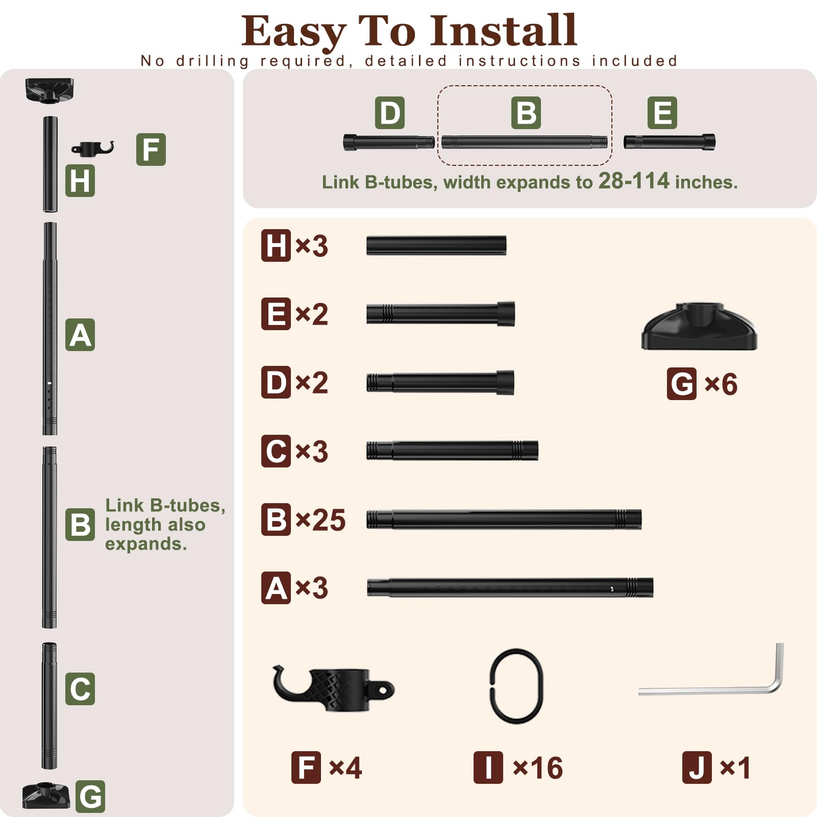 • 【Adjustable Height & Width Easily】This partition room dividers effortlessly adjusts its height from 4 to 10 feet and width from 28 to 114 inches to accommodate different space sizes. Both vertical and horizontal poles can extend or retract by 14.2 inches with the addition or removal of splice B bars. This flexibility allows for a customized fit, enhancing stability and optimizing space utilization.