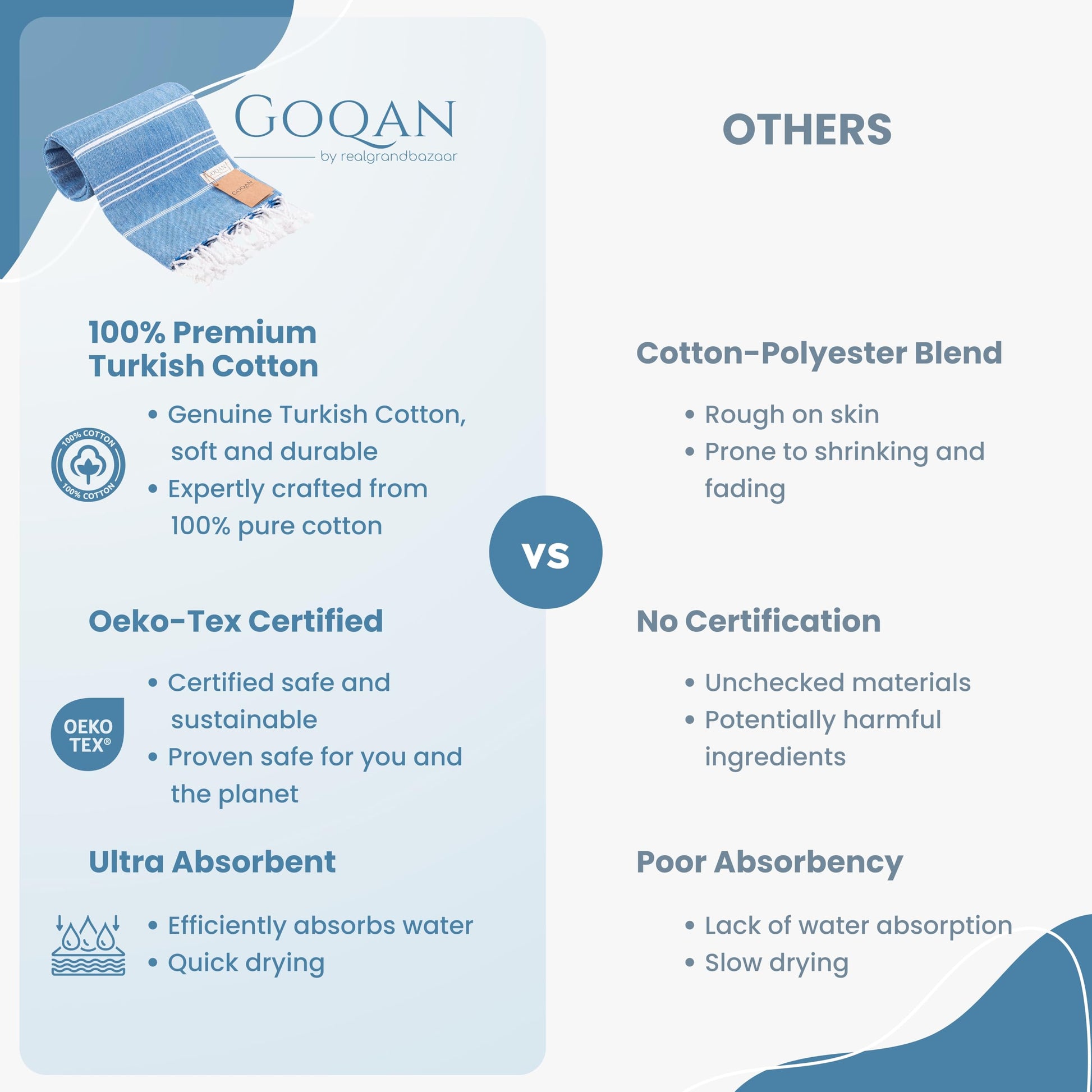 • 100% TURKISH PREMIUM COTTON: Experience luxury with the GOQAN Turkish Bath Towels made from 100% Turkish Cotton. These Turkish Cotton Towels offer unmatched softness, high absorbency, and quick-dry convenience—perfect for beach days, baths, or as a travel essential.