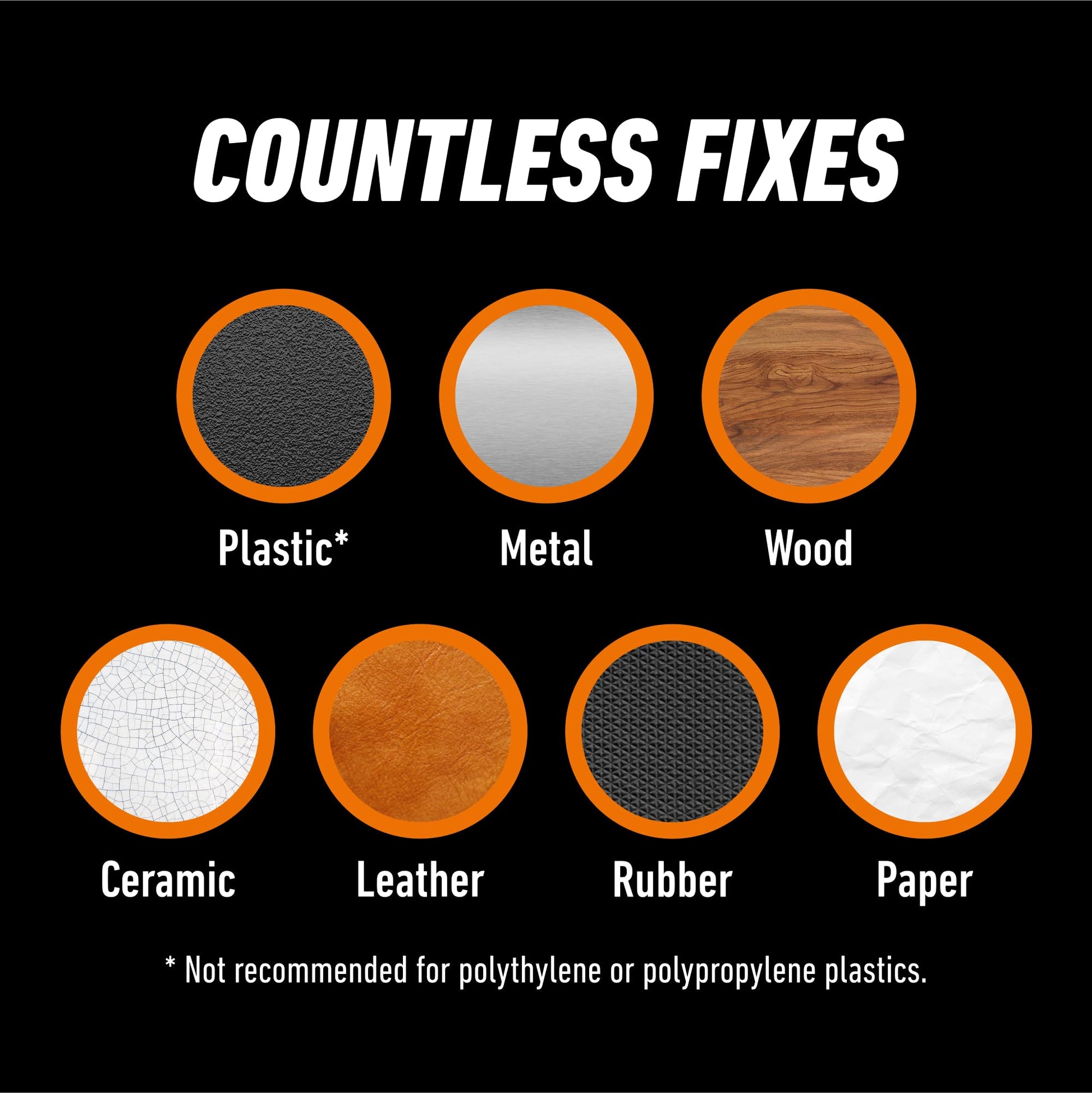 All purpose glue: Gorilla Super Glue is formulated for virtually all projects and repairs; it bonds glass, plastic*, wood, metal, ceramic, rubber, leather, paper, and more