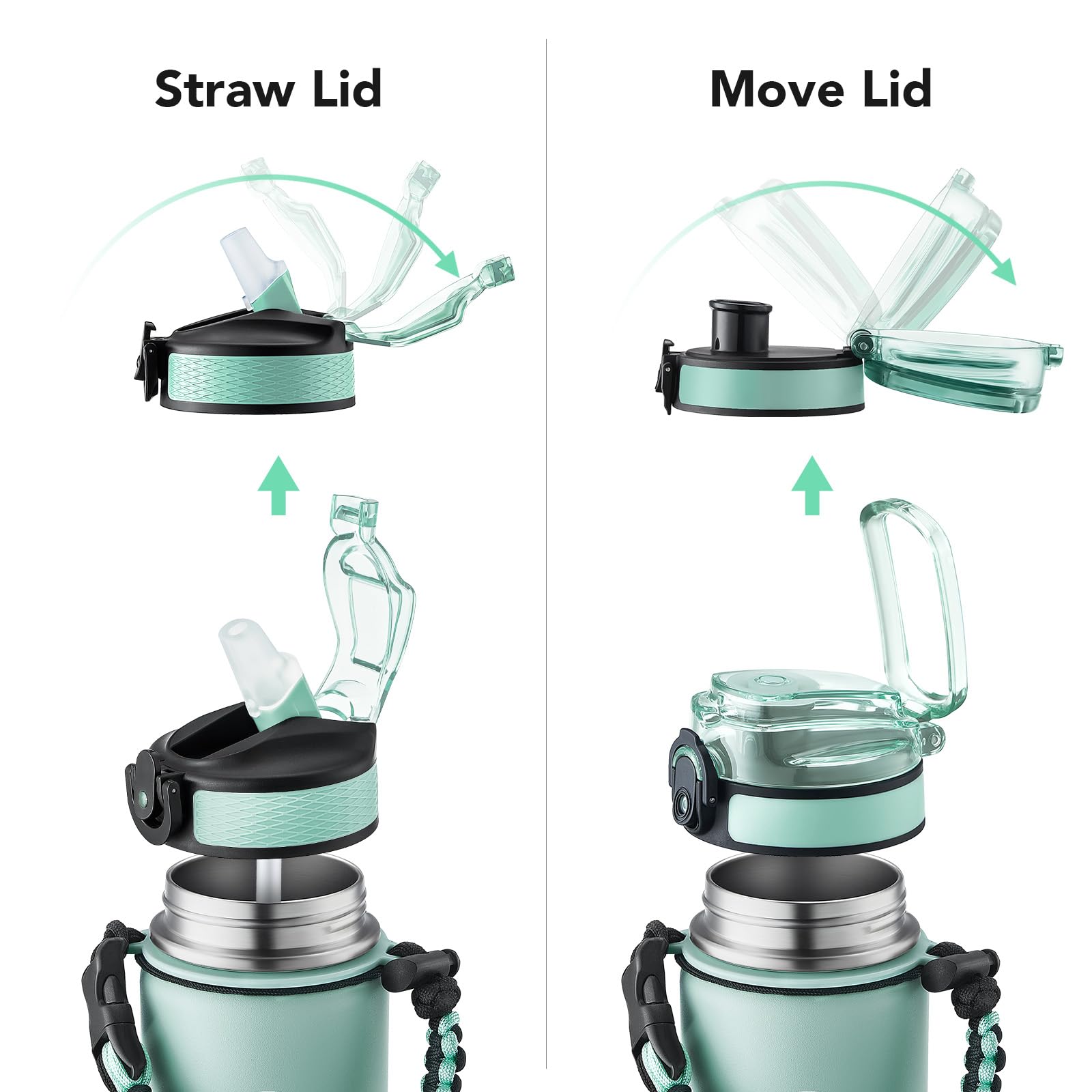 • Insulated water bottle 24 oz: 24 oz insulated water bottle has a matte finish and comes with 2 lids (Lid with Straw/No Straw) and a Paracord handle for easy portability; Its wide mouth makes it easy to fill, pour, and clean, and the leak-proof cap ensures worry transport.