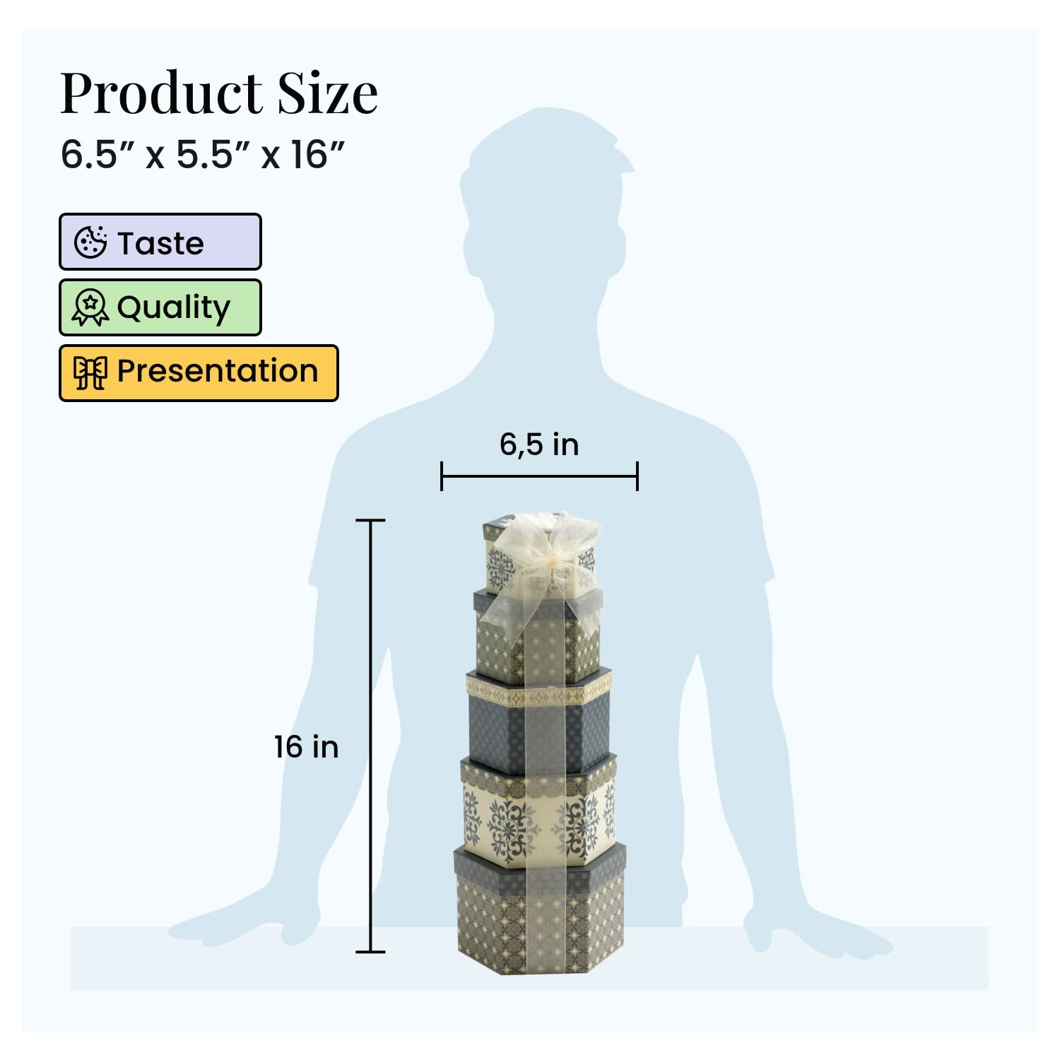 Details: You only get one chance to make that perfect impression. Delight your lucky recipient with this impressive 5 box tower. Open each box to find an exquisite treat including gourmet pretzels, cookies, sweets, treats and so much more!