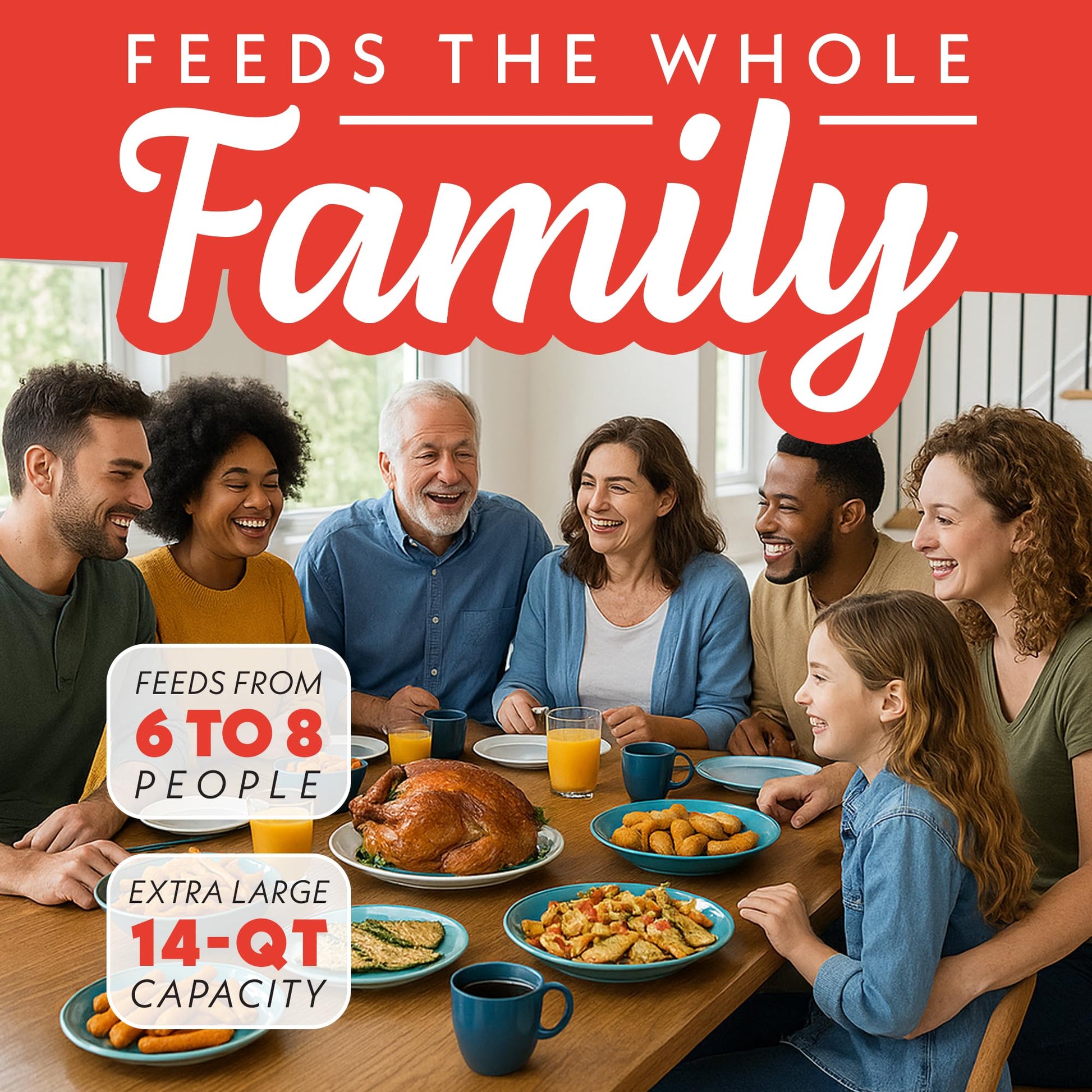• Spacious Family-Sized Capacity – The 14-quart chamber fits a 4 lb whole chicken or a 12″ pizza—perfect for batch cooking and weeknight dinners for 4–6 people