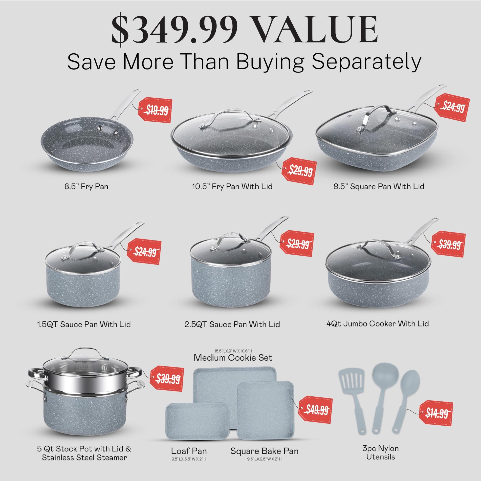• COMPLETE KITCHEN IN A BOX: This 20 Pc non toxic cookware set includes everything you need to completely outfit your kitchen and take cooking and baking to the next level, includes a full cookware set with a 8.5” frying pan, 10” frying pan, 9.5” square frying pan with, 1.5 QT saucepan with lid, 2.5Qt saucepan with lid, 5 QT stock pot with lid and stainless steel steamer, a 4 QT jumbo cooker with lid, plus a complete baking set with cookie sheet/jelly roll pan, loaf pan, square pan and 3 cooking utensils!