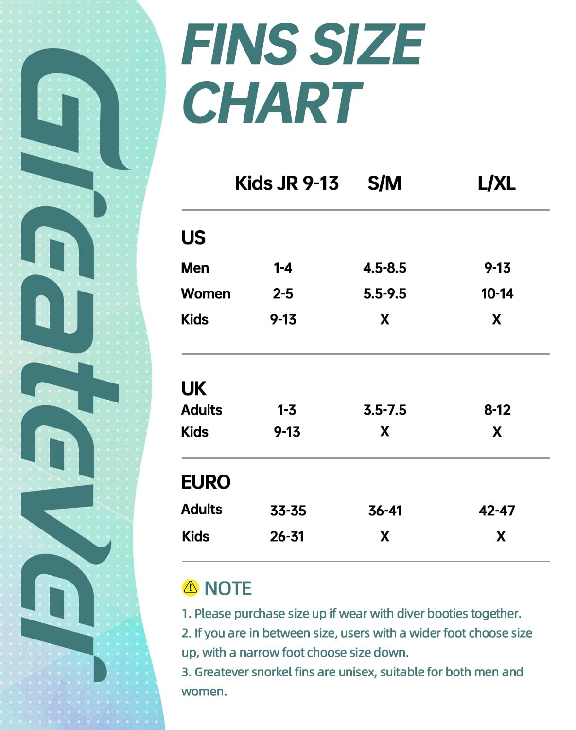 • 【PERFECT SWIM PARTNER】GREATEVER Snorkel Fins with scientific design, minimize fatigue and prevent cramps, it uses the unique open toe and cool flame shaped mesh instep design, it will help to reduce resistance and you will feel more comfortable and breathable. It's can be used with water shoes and water socks (Reminder: Please purchase sizes up if wear with dive booties together).
