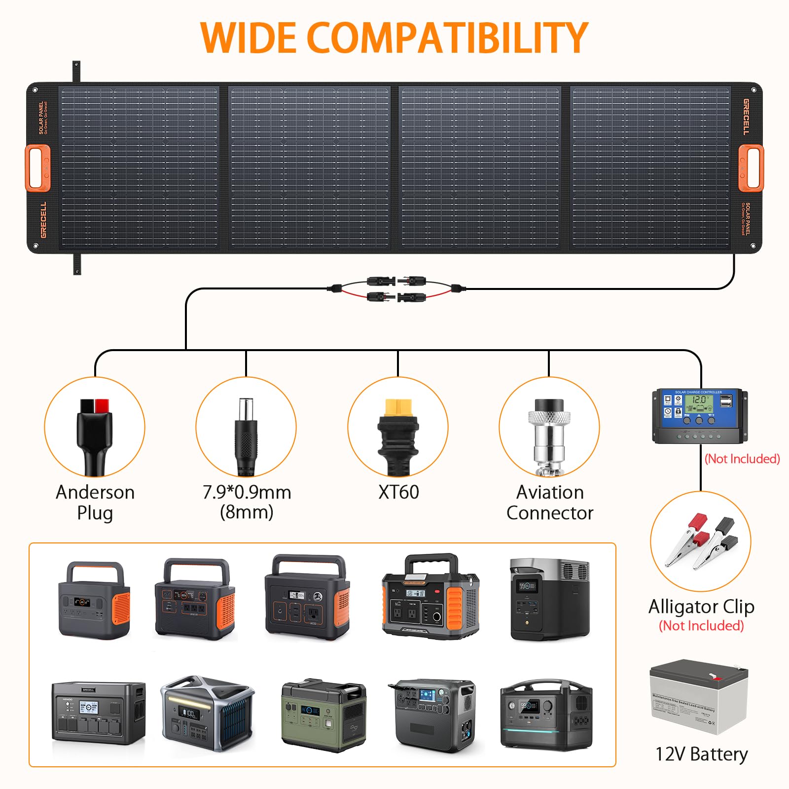 • COMPATIBLE WITH 95% OF POWER STATIONS - There is a separate 4-in-1 cable, the versatile 200W solar panel is widely compatible with most solar generators on the market, working well with power stations of Jackery, EF Ecoflow, Bluetti, Anker, and others, especially great with the GRECELL solar generators. With a charging controller and alligator clip(NOT INCLUDED), you can also charge your 12V batteries, such as AGM, gel & lithium-ion.