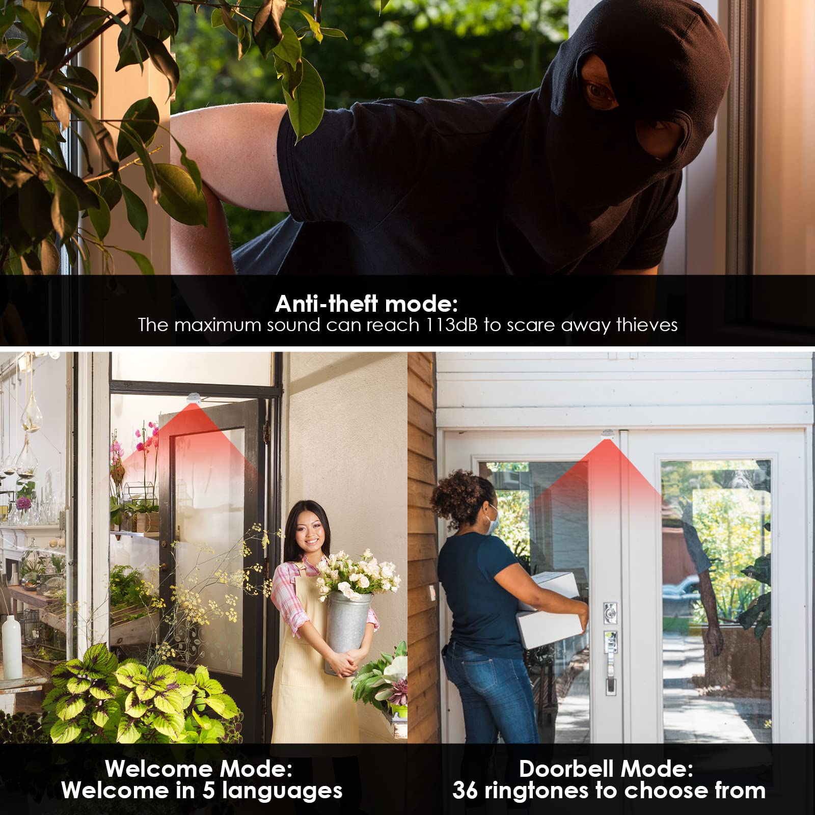 • 【5 Modes Motion Sensor Alarm】Not only serves as a motion sensor to detect alerts but also has other functions. Welcome / Doorbell / Alarm / Color light / Lighting Model. Motion detectors are essential in a home security system. Doorbell chimes can detect movement in the surrounding areas - driveways, front porches, gates, homes, sheds, offices, walkways, swimming pools, stores, etc. And trigger an alert to the linked receiver.