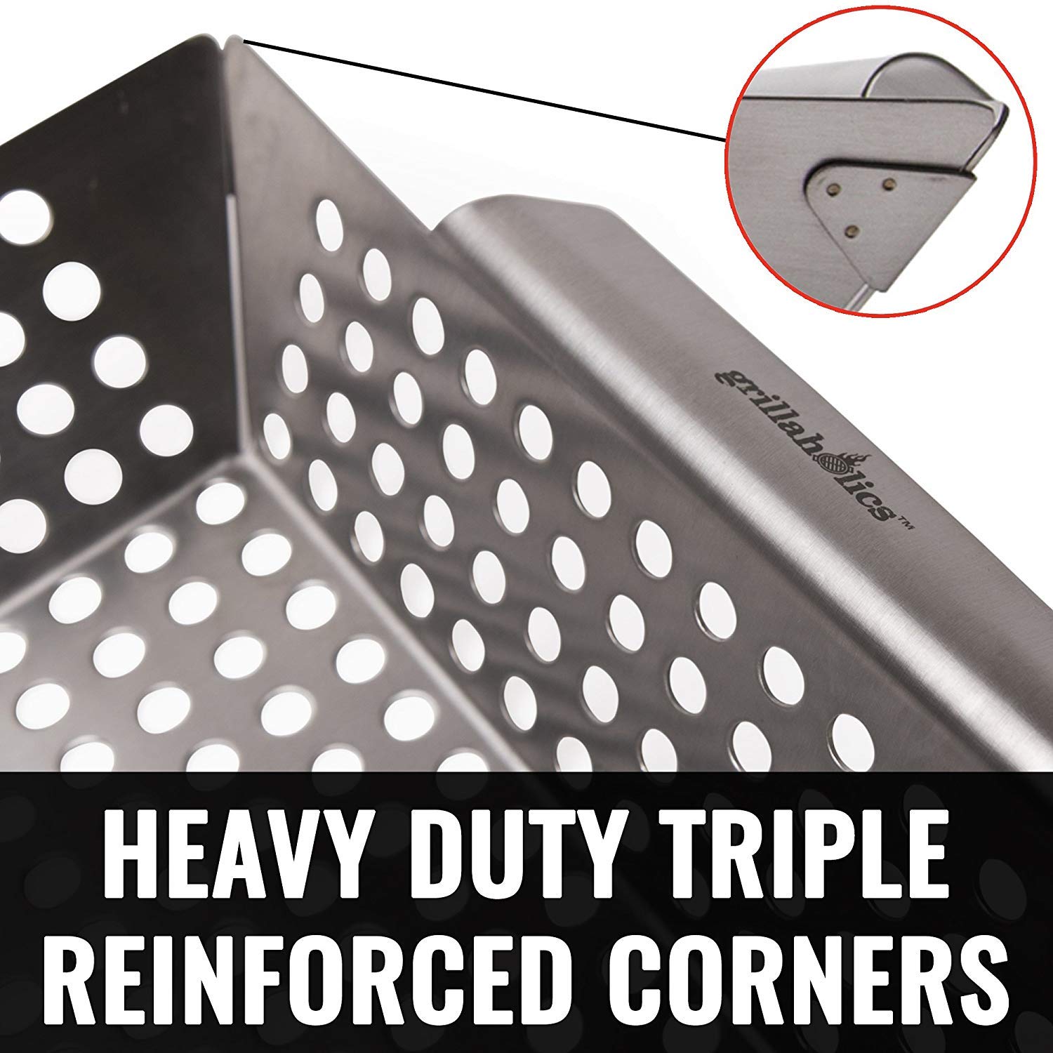 • HEAVY-DUTY DESIGN - Built to outlast the competition, our vegetable grill basket is crafted from heavy-duty, thick-gauge, food-grade stainless steel. Featuring triple-reinforced corner brackets, it can withstand intense heat and will be your trusted grilling companion for years. No more dealing with cheap, flimsy alternatives that warp and bend, or nonstick grill baskets that flake and peel under high heat!