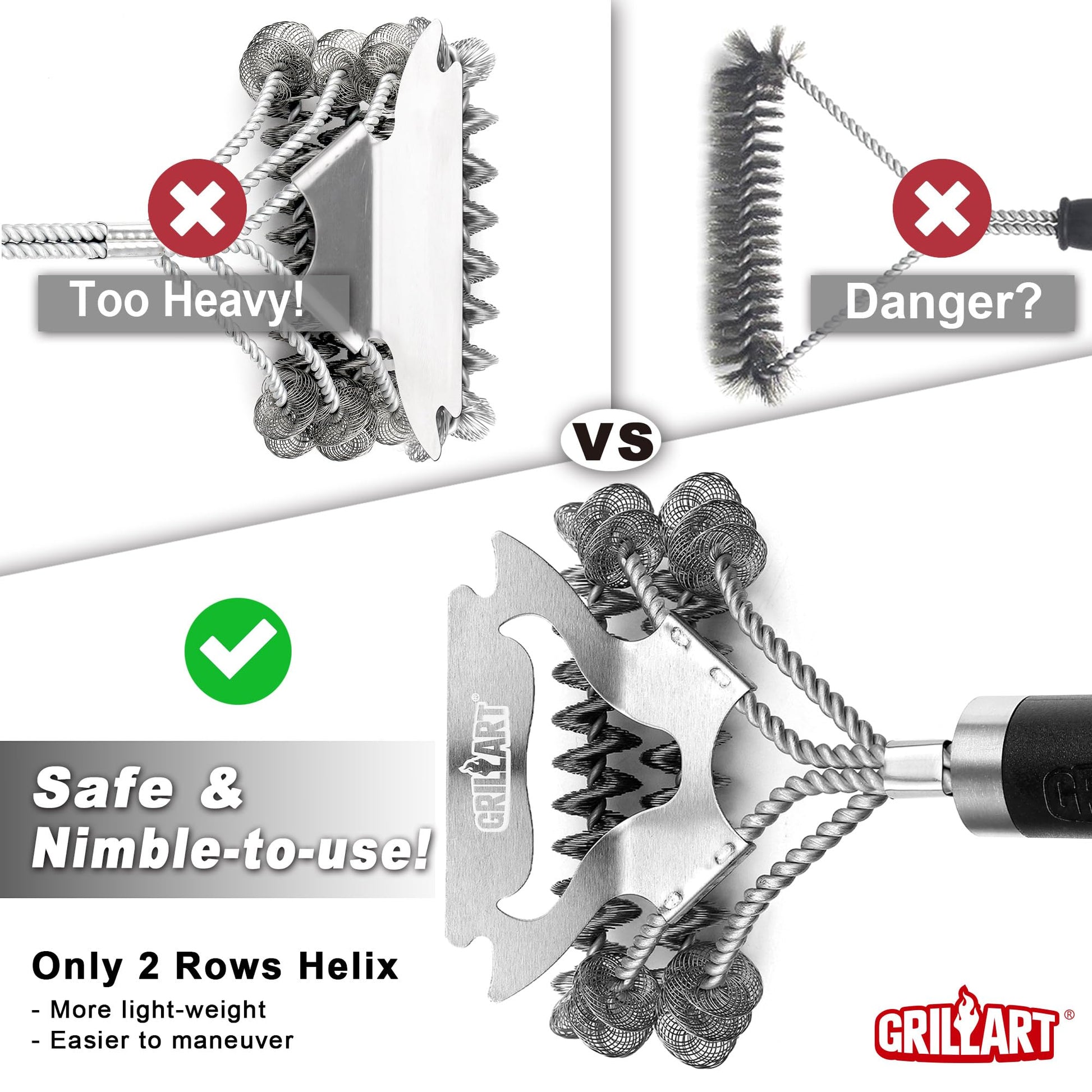 • 【Handy to Use - Double helix, Not Three】: Compared with the common 3-layer helix design, our 2-layer maybe better for you. 2-layer means lighter weight and smarter size, you can clean both large & small grill more easily as there’s no extra weight or bulky size to hinder your cleaning progress, and ultimately make your cleaning more laborious. A good BBQ brush should exist for your ease of use, rather than sacrificing its due convenience in pursuit of the so-called larger cleaning area;