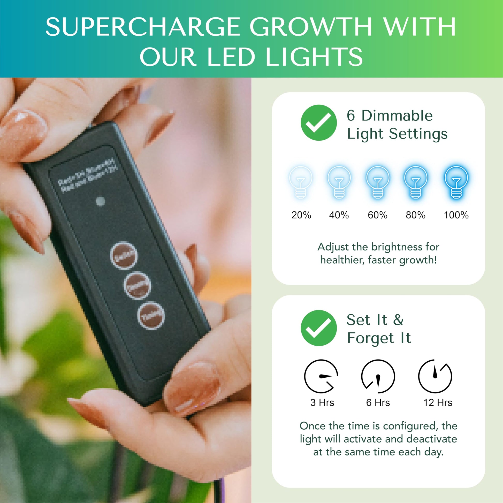 • [LED Grow Lights for Seed Starting & Stronger Seedlings] Boost plant growth with our powerful LED grow lights, featuring 16 white and 4 blue LEDs to replicate natural sunlight for optimal germination and seedling strength. The white LEDs encourage healthy seedling development, while the blue LEDs strengthen root systems for improved survival rates. With adjustable brightness settings, you can customize the lighting for microgreens, vegetables, flowers, and herbs at any growth stage, ensuring faster and healthier indoor plant growth.