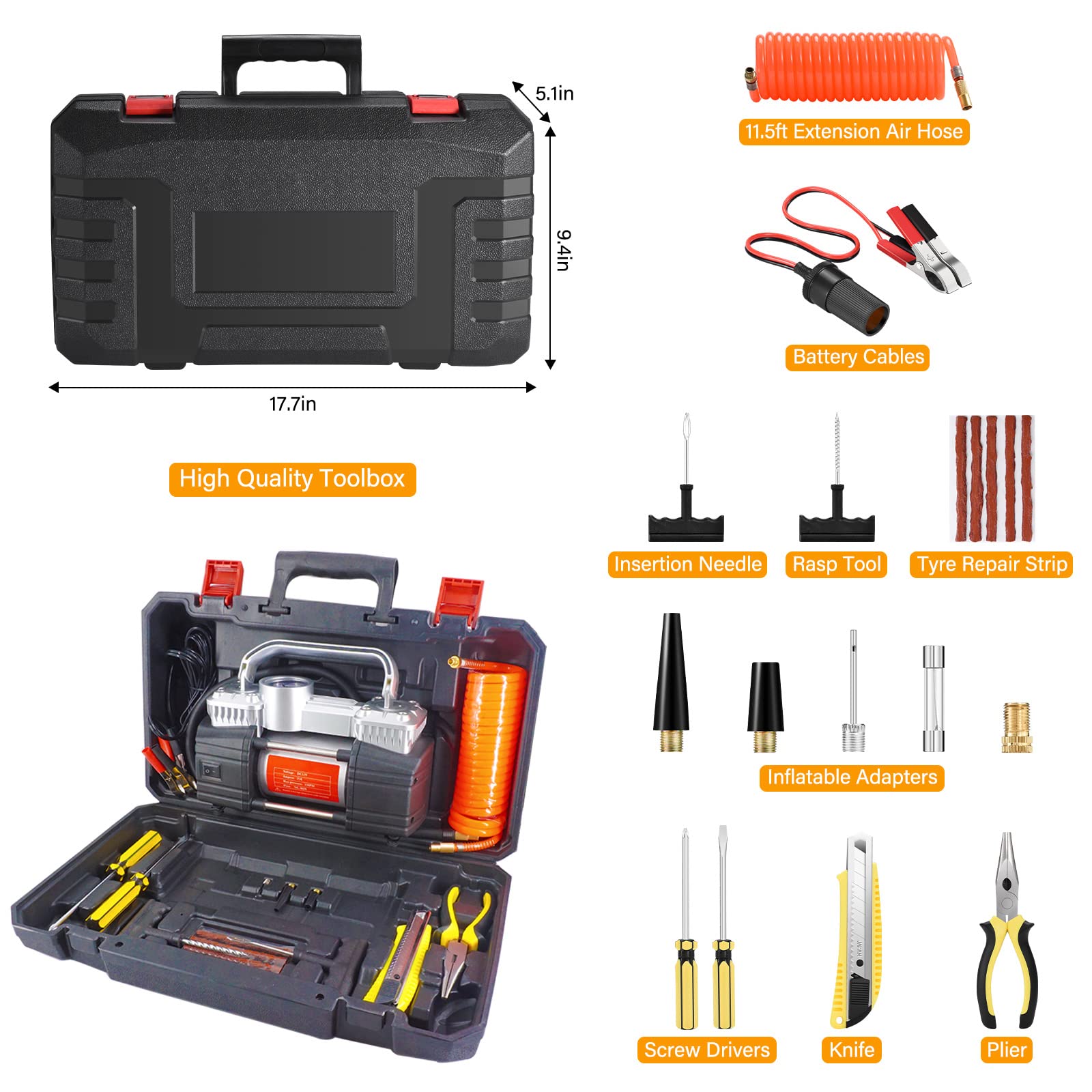 • 【TIRE REPAIR KIT】: Considering the tire leaking,we put a tire repair tool in the toolbox. Tire repair kit includes plier,knife,screw drivers,tyre repair strip,split-eye insertion needle,rasp tool. Also equipped with 3 nozzles adaptors for easily pumping up air mattresses/bikes/toys/inflatables.