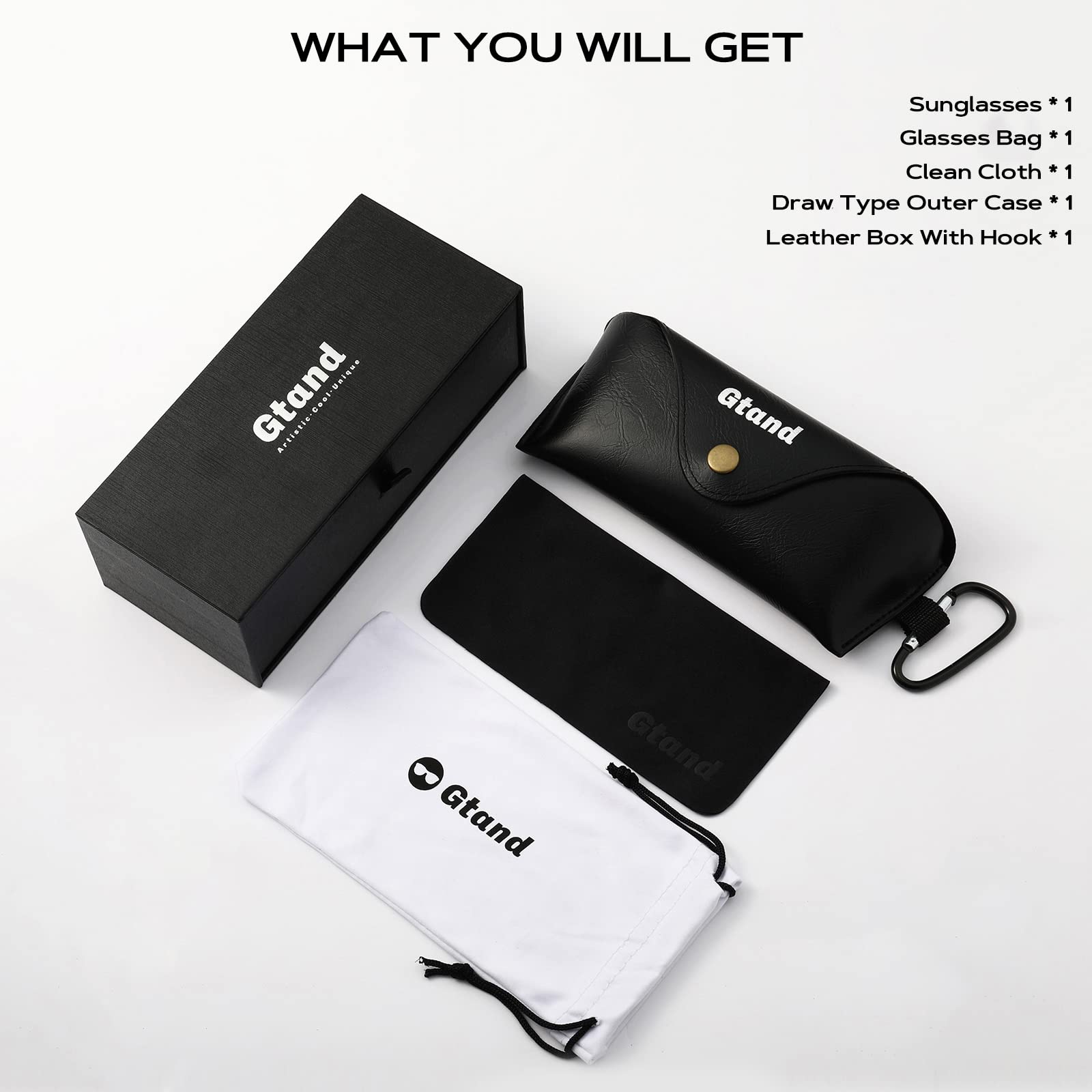 • WHAT YOU WILL GET - 1. Sunglasses*1 - 2. Drawer type outer case*1 - 3. Leather box with portable hook*1 - 4. Black clean cloth*1 - 5. Glasses bag*1. These exquisite gift ideas package will be wonderful gifts for your family and friends!
