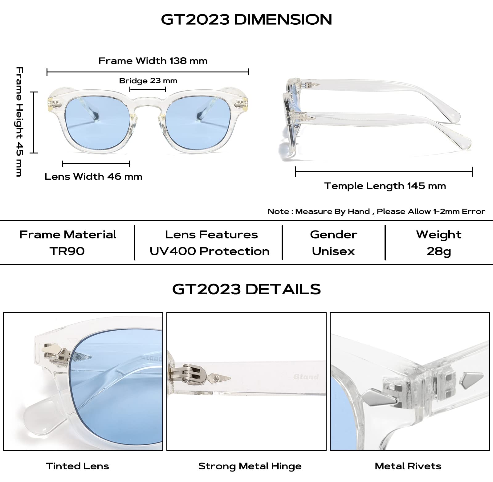 • PRODUCT DIMENSIONS - Lens Width 46mm(1.81 inches)- Frame Height 45mm(1.77 inches)- Frame Width 138mm(5.43 inches)- Temple Length 145mm(5.71 inches)- Nose Bridge 23mm(0.91 inches)- Lightweight 28g.