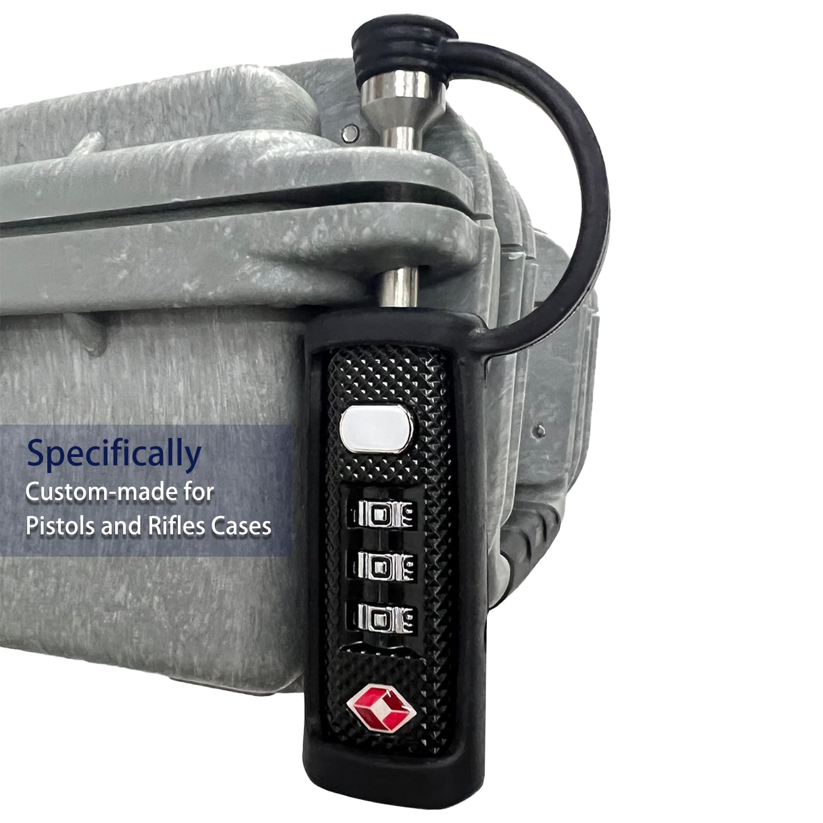 • 1. Hard pistol cases lock size 3.9”x 0.95”x 1.05”inches. Compliant with TSA Key (KEY NOT INCLUDED). The hard pistol cases firearm lock pin is 1.05"(L)x0.23"(W). Our TSA approved hard gun case locks are made from high quality alloy, have a protective rubber sleeve and a heavy duty cut resistant single shaft exterior that is durable enough to take a huge beating. Whether you use the combo gun case lock indoor, or travel, rest assured that these gun case padlocks will deter any opportunistic thief.