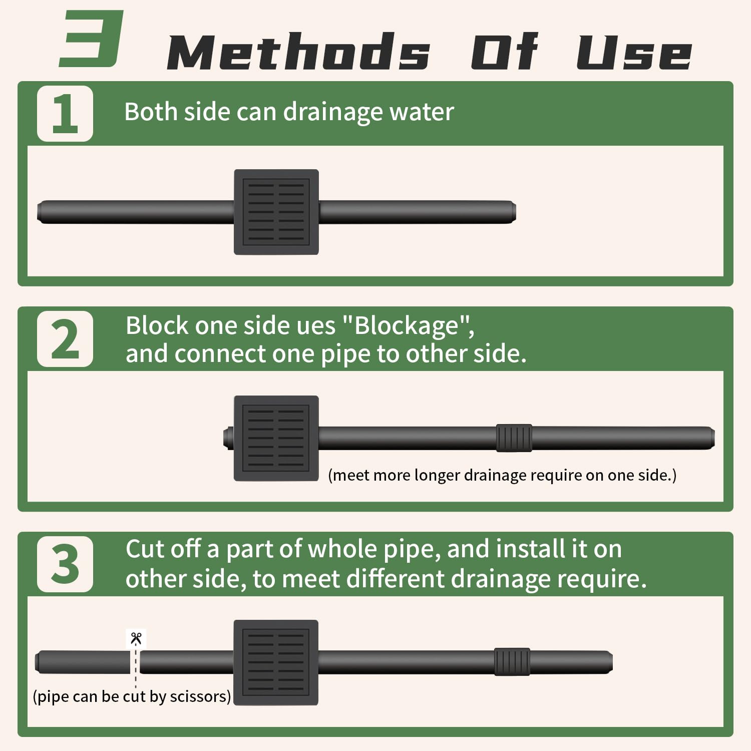 • 🌧【3 Methods of Use】 ①You can direct install two pipes on both sides to drain water, Improve drainage efficiency. ②You can block one side use our "blockage". and connect one pipe with another pipe to another side together, meet more longer drainage require on one side. ③Cut off a part of whole pipe, and connect another pipe install it on other side , to meet drainage demand with one side long side and another side short side drainage require.