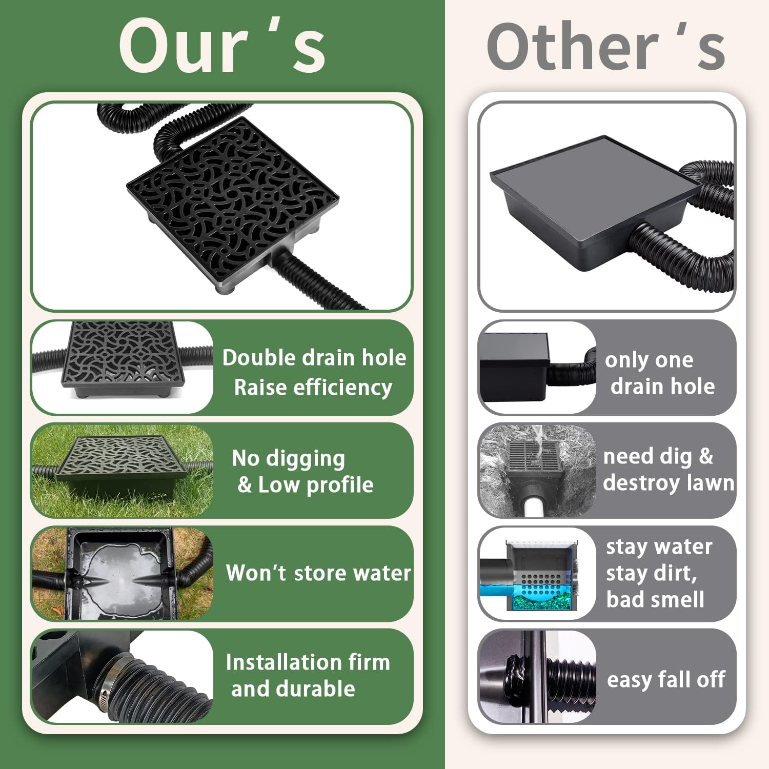 • 🌧【US Patented Design】Patent No. D1018796. ①Catch basin has double drain holes, improves efficiency. Kit include 2pcs 8Ft Pipe use for drainage on both sides. ②Catch Basin Special Slope Design - Won't accumulate water and dirt. ③Flexible pipes can be fixed in shape according to your needs. and can be connected with each other for a longer distance, Easily divert rainwater where you want.