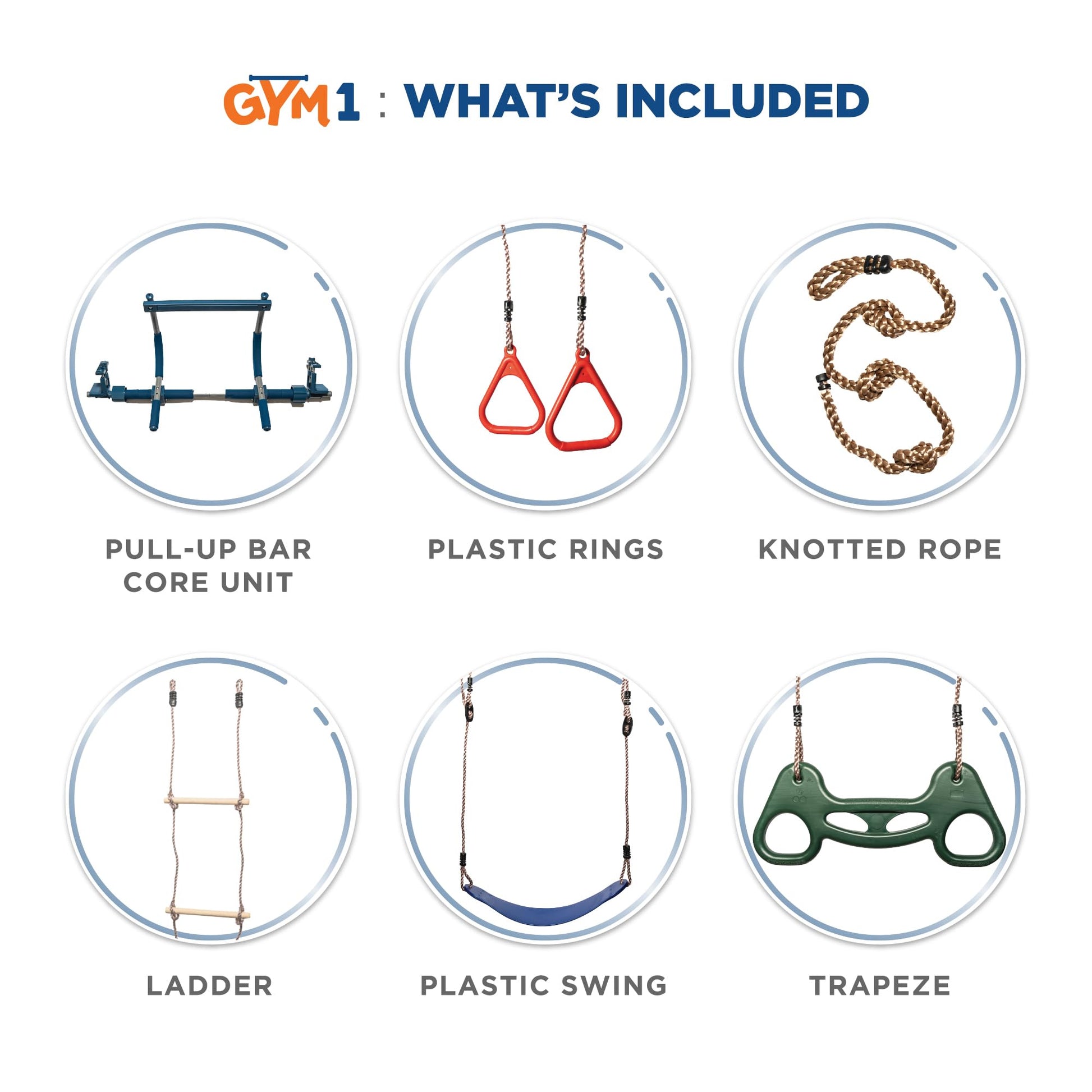 Gym1 6-Piece Doorway Gym Indoor Playground - 6-Piece, Blue - Indoor Playset with Sensory Swing, Pull-Up Bar & Rings, Trapeze, Ladder & Knotted Rope