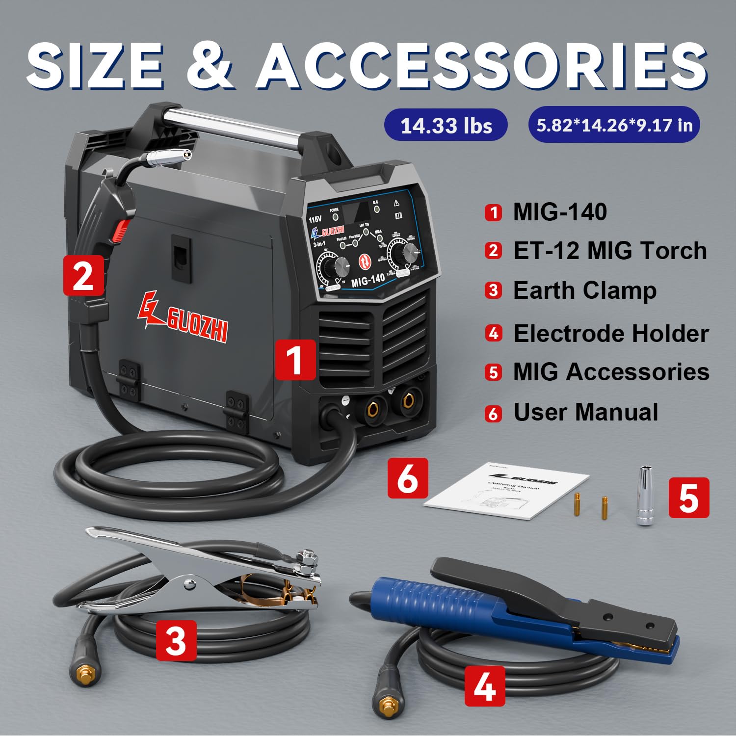 • 【Package List】: GUOZHI 3 in 1 welding machine, the package includes 1*140amp mig welder, 1*Electrode Holder(500A), 1*Earth Clamp(500A), 1*MIG Gun(Pre-installed), Gun Accessories.