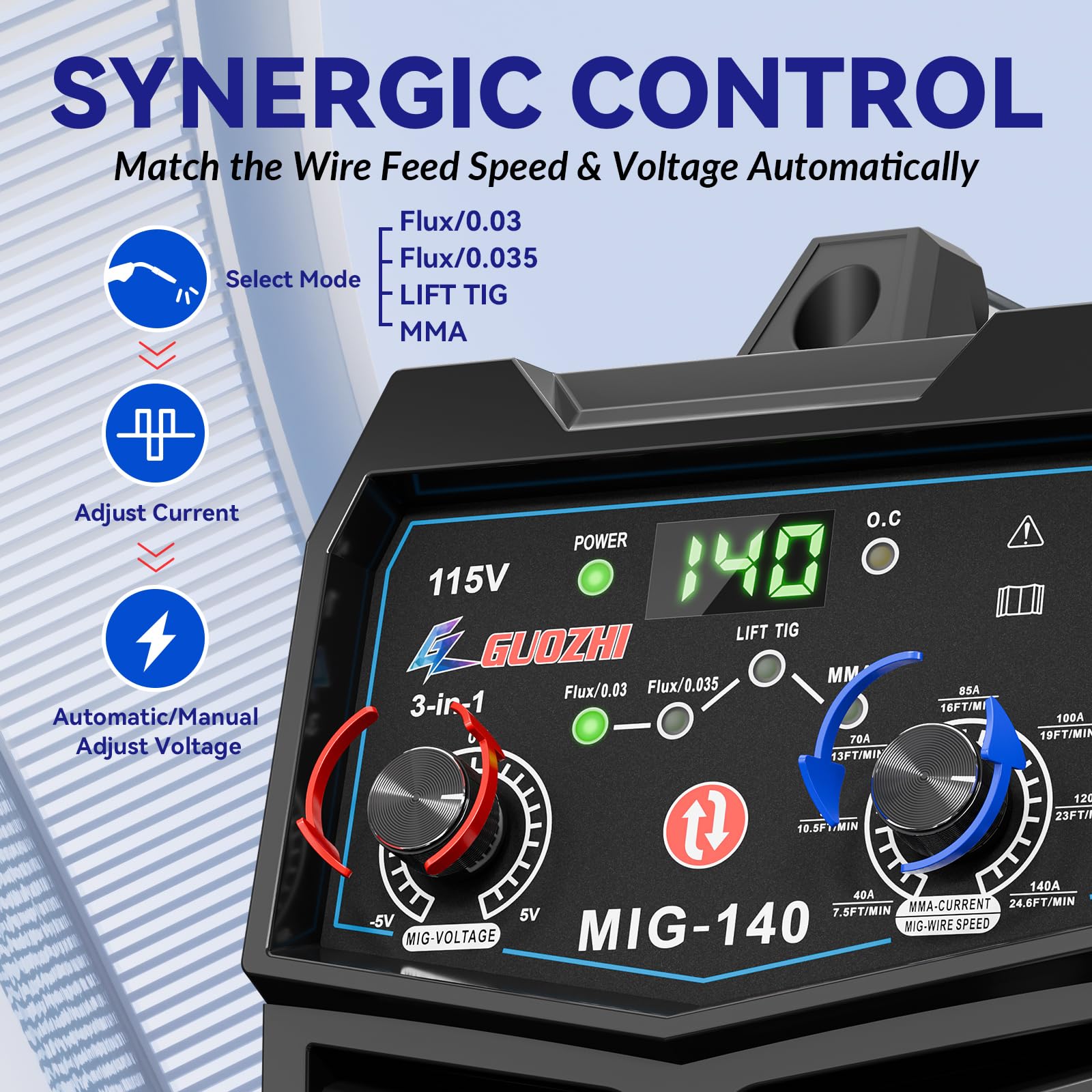 GZ GUOZHI 140A MIG Welder, 3 in 1 Welder FLUX MIG/ARC/Lift TIG Multi-Process Mig Welder, 110V Welding Machine, Welder Machine 110v Flux Core Welder with Welding Gun