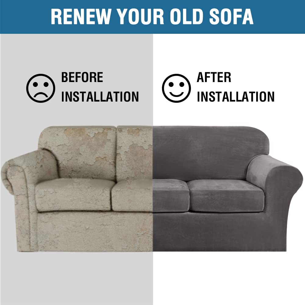 • GREAT FIT: This innovated 4 Piece sofa couch cover is crafted from luxurious velvet plush fabric, including 1 piece of base cover and 3 piece of cushion covers. Sofa slipcovers (fit sitting width between 72-90 inch). Feature one-size-fits-most, kindly measure before ordering