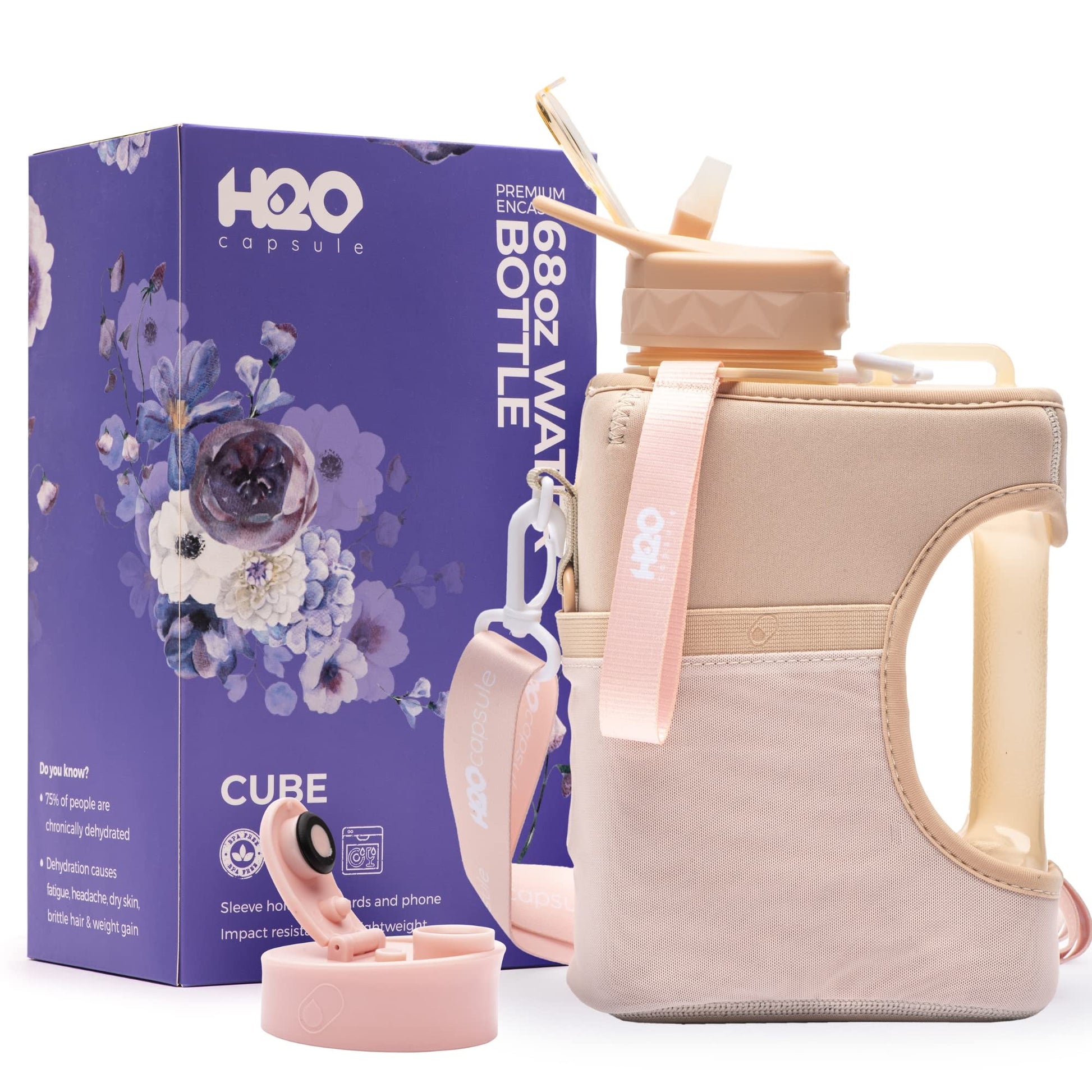 H2O Capsule Half Gallon Cube Square Water Bottle - 2.2L Water Bottle with Strap, Storage Sleeve, Covered Straw and Chug Lid – BPA Free Reusable Sports Water Jug with Handle, (68 Ounce), (Neutral)